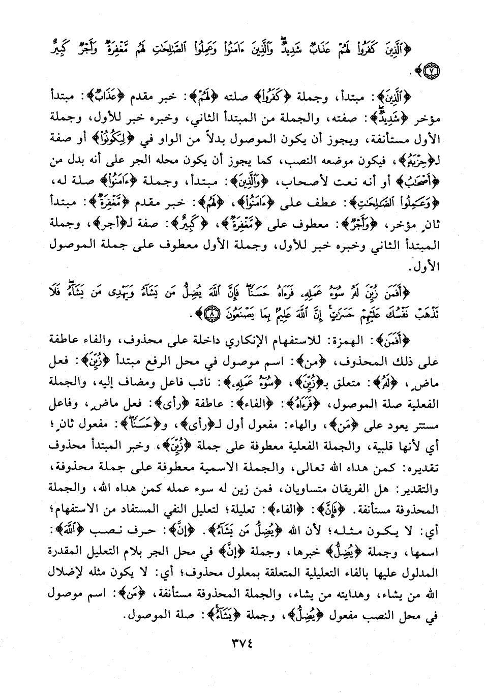 {أَفَمَنْ}: الهمزة: للاستفهام الإنكاري داخلة على محذوف، والفاء عاطفة على ذلك المحذوف، {منِ}: اسم موصول في محل الرفع مبتدأ {زُيِّنَ}: فعل ماضٍ، {لَهُ}: متعلق بـ {زُيِّنَ}، {سُوءُ عَمَلِهِ}: نائب فاعل ومضاف إليه، والجملة الفعلية صلة الموصول، {فَرَآهُ}: {الفاء}: عاطفة {رأى}: فعل ماضٍ، وفاعل مستتر يعود على {مَن}، والهاء: مفعول أول لـ {رأى}، و {حَسَنًا}: مفعول ثانٍ؛ أي لأنها قلبية، والجملة الفعلية معطوفة على جملة {زُيِّنَ}، وخبر المبتدأ محذوف تقديره: كمن هداه الله تعالى، والجملة الاسمية معطوفة على جملة محذوفة، والتقدير: هل الفريقان متساويان، فمن زين له سوء عمله كمن هداه الله، والجملة المحذوفة مستأنفة. {فَإِنَّ}: {الفاء}: تعليلة؛ لتعليل النفي المستفاد من الاستفهام؛ أي: لا يكون مثله؛ لأن الله {يُضِلُّ مَنْ يَشَاءُ}. {إِنَّ}: حرف نصب {اللَّهَ}: اسمها، وجملة {يُضِلُّ} خبرها، وجملة {إِنَّ} في محل الجر بلام التعليل المقدرة المدلول عليها بالفاء التعليلية المتعلقة بمعلول محذوف؛ أي: لا يكون مثله لإضلال الله من يشاء، وهدايته من يشاء، والجملة المحذوفة مستأنفة، {مَن}: اسم موصول في محل النصب مفعول {يُضِلُّ}، وجملة {يَشَاءُ}: صلة الموصول.