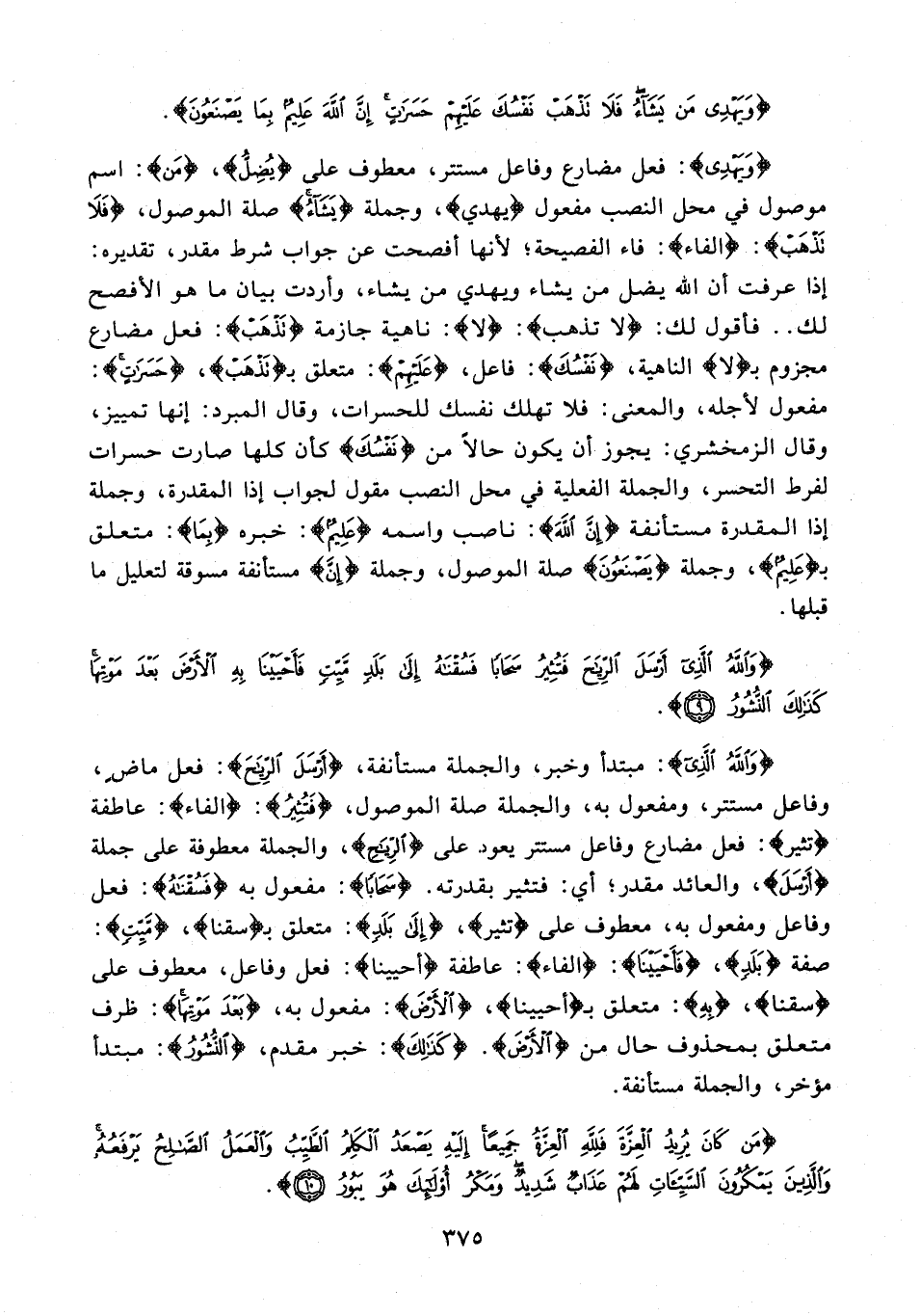 {وَاللَّهُ الَّذِي}: مبتدأ وخبر، والجملة مستأنفة، {أَرْسَلَ الرِّيَاحَ}: فعل ماضٍ، وفاعل مستتر، ومفعول به، والجملة صلة الموصول، {فَتُثِيرُ}: {الفاء}: عاطفة {تثير}: فعل مضارع وفاعل مستتر يعود على {الرِّيَاحَ}، والجملة معطوفة على جملة {أَرْسَلَ}، والعائد مقدر؛ أي: فتثير بقدرته. {سَحَابًا}: مفعول به {فَسُقْنَاهُ}: فعل وفاعل ومفعول به، معطوف على {تثير}، {إِلَى بَلَدٍ}: متعلق بـ {سقنا}، {مَيِّتٍ}: صفة {بَلَدٍ}، {فَأَحْيَيْنَا}: {الفاء}: عاطفة {أحيينا}: فعل وفاعل، معطوف على {سقنا}، {بِهِ}: متعلق بـ {أحيينا}، {الْأَرْضَ}: مفعول به، {بَعْدَ مَوْتِهَا}: ظرف متعلق بمحذوف حال من {الْأَرْضَ}. {كَذَلِكَ}: خبر مقدم، {النُّشُورُ}: مبتدأ مؤخر، والجملة مستأنفة.