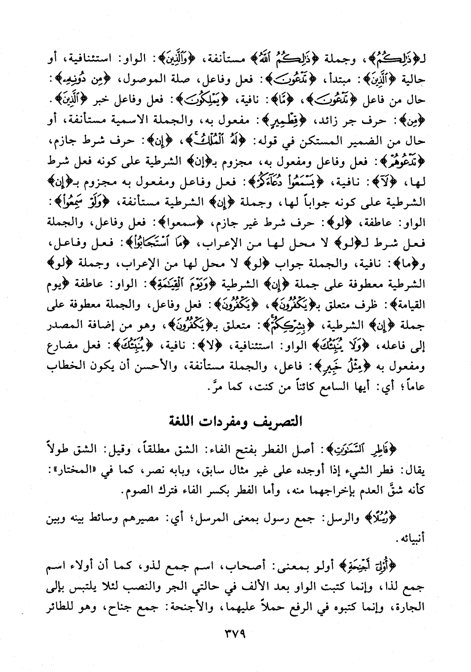 لـ {ذَلِكُمُ}، وجملة {ذَلِكُمُ اللَّهُ} مستأنفة، {وَالَّذِينَ}: الواو: استئنافية، أو حالية {الَّذِينَ}: مبتدأ، {تَدْعُونَ}: فعل وفاعل، صلة الموصول، {مِنْ دُونِهِ}: حال من فاعل {تَدْعُونَ}، {مَّا}: نافية، {يَمْلِكُونَ}: فعل وفاعل خبر {الَّذِينَ}. {مِن}: حرف جر زائد، {قِطْمِيرٍ}: مفعول به، والجملة الاسمية مستأنفة، أو حال من الضمير المستكن في قوله: {لَهُ الْمُلْكُ}، {إِنْ}: حرف شرط جازم، {تَدْعُوهُمْ}: فعل وفاعل ومفعول به، مجزوم بـ {إن} الشرطية على كونه فعل شرط لها، {لَا}: نافية، {يَسْمَعُوا دُعَاءَكُمْ}: فعل وفاعل ومفعول به مجزوم بـ {إن} الشرطية على كونه جوابًا لها، وجملة {إِن} الشرطية مستأنفة، {وَلَوْ سَمِعُوا}: الواو: عاطفة، {لَوْ}: حرف شرط غير جازم، {سَمِعُوا}: فعل وفاعل، والجملة فعل شرط لـ {لو} لا محل لها من الإعراب، {مَا اسْتَجَابُوا}: فعل وفاعل، و {ما}: نافية، والجملة جواب {لو} لا محل لها من الإعراب، وجملة {لو} الشرطية معطوفة على جملة {إِن} الشرطية {وَيَوْمَ الْقِيَامَةِ}: الواو: عاطفة {يوم القيامة}: ظرف متعلق بـ {يَكْفُرُونَ}، {يَكْفُرُونَ}: فعل وفاعل، والجملة معطوفة على جملة {إِن} الشرطية، {بِشِرْكِكُمْ}: متعلق بـ {يَكْفُرُونَ}، وهو من إضافة المصدر إلى فاعله، {وَلَا يُنَبِّئُكَ} الواو: استئنافية، {لا}: نافية، {يُنَبِّئُكَ}: فعل مضارع ومفعول به {مِثْلُ خَبِيرٍ}: فاعل، والجملة مستأنفة، والأحسن أن يكون الخطاب عامًا؛ أي: أيها السامع كائنًا من كنت، كما مرَّ.