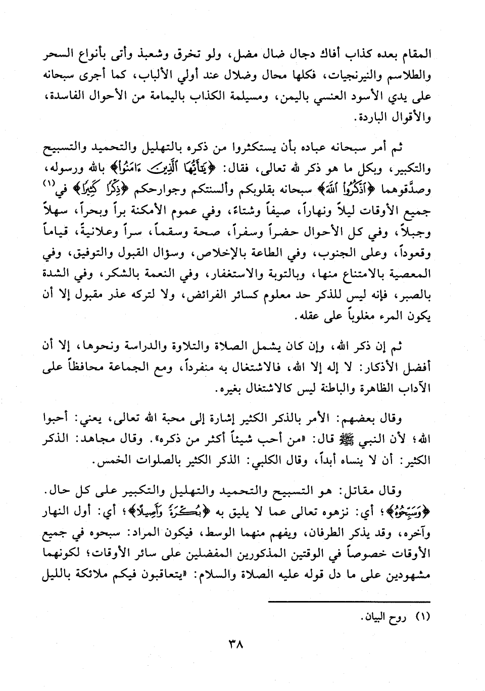 42 - وقال مقاتل: هو التسبيح والتحميد والتهليل والتكبير على كل حال. {وَسَبِّحُوهُ}؛ أي: نزهوه تعالى عما لا يليق به {بُكْرَةً وَأَصِيلًا}؛ أي: أول النهار وآخره، وقد يذكر الطرفان، ويفهم منهما الوسط، فيكون المراد: سبحوه في جميع الأوقات خصوصًا في الوقتين المذكورين المفضلين على سائر الأوقات؛ لكونهما مشهودين على ما دل قوله عليه الصلاة والسلام: "يتعاقبون فيكم ملائكة بالليل