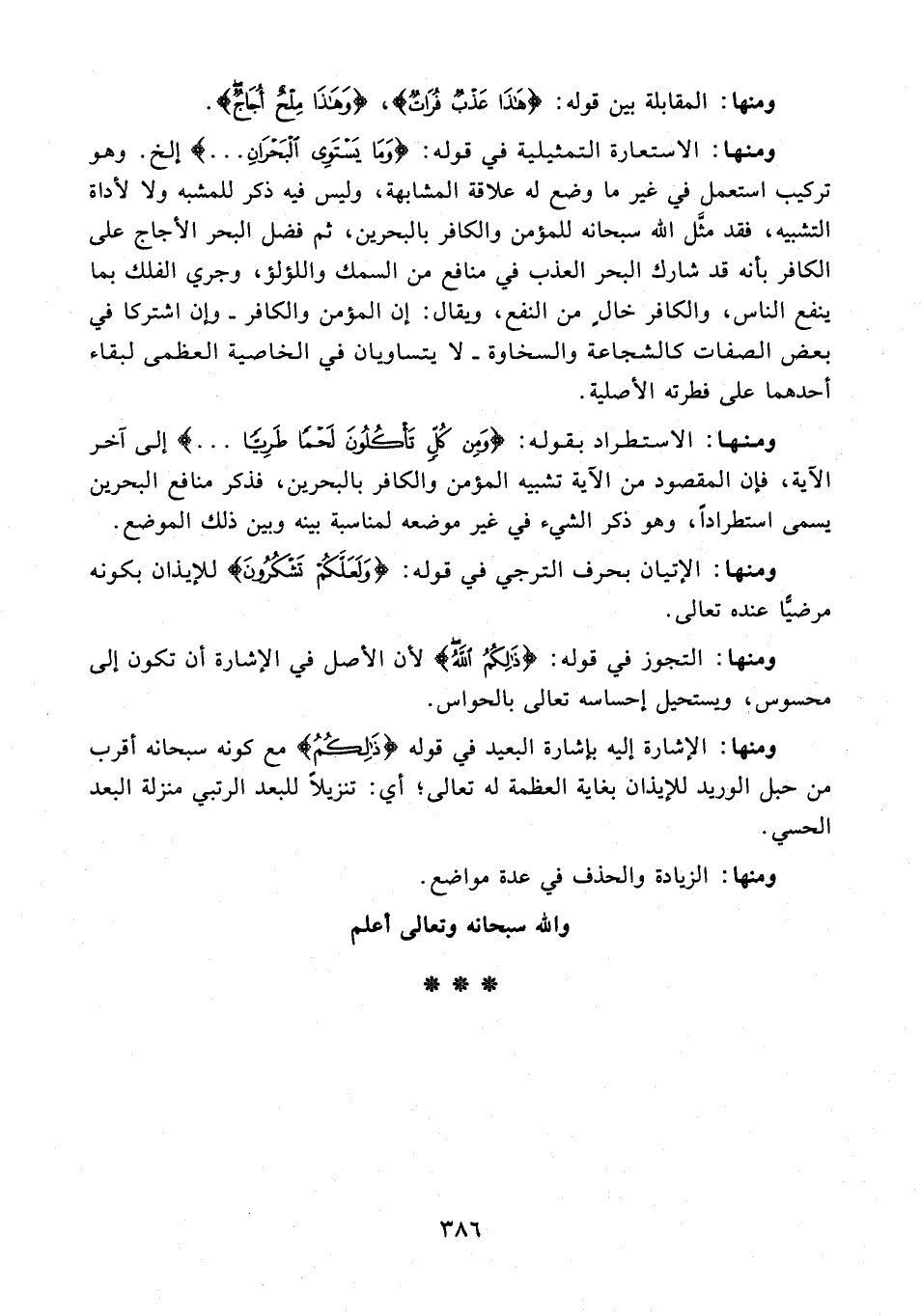 ومنها: الاستطراد بقوله: {وَمِنْ كُلٍّ تَأْكُلُونَ لَحْمًا طَرِيًّا ...} إلى آخر الآية، فإن المقصود من الآية تشبيه المؤمن والكافر بالبحرين، فذكر منافع البحرين يسمى استطرادًا، وهو ذكر الشيء في غير موضعه لمناسبة بينه وبين ذلك الموضع.