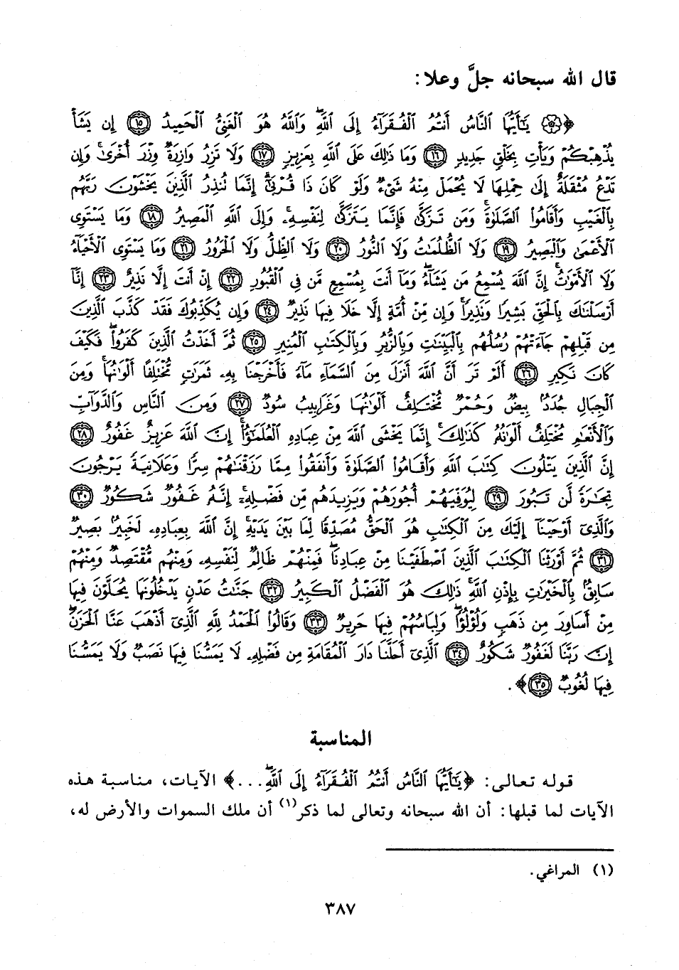{يَا أَيُّهَا النَّاسُ أَنْتُمُ الْفُقَرَاءُ إِلَى اللَّهِ وَاللَّهُ هُوَ الْغَنِيُّ الْحَمِيدُ (15) إِنْ يَشَأْ يُذْهِبْكُمْ وَيَأْتِ بِخَلْقٍ جَدِيدٍ (16) وَمَا ذَلِكَ عَلَى اللَّهِ بِعَزِيزٍ (17) وَلَا تَزِرُ وَازِرَةٌ وِزْرَ أُخْرَى وَإِنْ تَدْعُ مُثْقَلَةٌ إِلَى حِمْلِهَا لَا يُحْمَلْ مِنْهُ شَيْءٌ وَلَوْ كَانَ ذَا قُرْبَى إِنَّمَا تُنْذِرُ الَّذِينَ يَخْشَوْنَ رَبَّهُمْ بِالْغَيْبِ وَأَقَامُوا الصَّلَاةَ وَمَنْ تَزَكَّى فَإِنَّمَا يَتَزَكَّى لِنَفْسِهِ وَإِلَى اللَّهِ الْمَصِيرُ (18) وَمَا يَسْتَوِي الْأَعْمَى وَالْبَصِيرُ (19) وَلَا الظُّلُمَاتُ وَلَا النُّورُ (20) وَلَا الظِّلُّ وَلَا الْحَرُورُ (21) وَمَا يَسْتَوِي الْأَحْيَاءُ وَلَا الْأَمْوَاتُ إِنَّ اللَّهَ يُسْمِعُ مَنْ يَشَاءُ وَمَا أَنْتَ بِمُسْمِعٍ مَنْ فِي الْقُبُورِ (22) إِنْ أَنْتَ إِلَّا نَذِيرٌ (23) إِنَّا أَرْسَلْنَاكَ بِالْحَقِّ بَشِيرًا وَنَذِيرًا وَإِنْ مِنْ أُمَّةٍ إِلَّا خَلَا فِيهَا نَذِيرٌ (24) وَإِنْ يُكَذِّبُوكَ فَقَدْ كَذَّبَ الَّذِينَ مِنْ قَبْلِهِمْ جَاءَتْهُمْ رُسُلُهُمْ بِالْبَيِّنَاتِ وَبِالزُّبُرِ وَبِالْكِتَابِ الْمُنِيرِ (25) ثُمَّ أَخَذْتُ الَّذِينَ كَفَرُوا فَكَيْفَ كَانَ نَكِيرِ (26) أَلَمْ تَرَ أَنَّ اللَّهَ أَنْزَلَ مِنَ السَّمَاءِ مَاءً فَأَخْرَجْنَا بِهِ ثَمَرَاتٍ مُخْتَلِفًا أَلْوَانُهَا وَمِنَ الْجِبَالِ جُدَدٌ بِيضٌ وَحُمْرٌ مُخْتَلِفٌ أَلْوَانُهَا وَغَرَابِيبُ سُودٌ (27) وَمِنَ النَّاسِ وَالدَّوَابِّ وَالْأَنْعَامِ مُخْتَلِفٌ أَلْوَانُهُ كَذَلِكَ إِنَّمَا يَخْشَى اللَّهَ مِنْ عِبَادِهِ الْعُلَمَاءُ إِنَّ اللَّهَ عَزِيزٌ غَفُورٌ (28) إِنَّ الَّذِينَ يَتْلُونَ كِتَابَ اللَّهِ وَأَقَامُوا الصَّلَاةَ وَأَنْفَقُوا مِمَّا رَزَقْنَاهُمْ سِرًّا وَعَلَانِيَةً يَرْجُونَ تِجَارَةً لَنْ تَبُورَ (29) لِيُوَفِّيَهُمْ أُجُورَهُمْ وَيَزِيدَهُمْ مِنْ فَضْلِهِ إِنَّهُ غَفُورٌ شَكُورٌ (30) وَالَّذِي أَوْحَيْنَا إِلَيْكَ مِنَ الْكِتَابِ هُوَ الْحَقُّ مُصَدِّقًا لِمَا بَيْنَ يَدَيْهِ إِنَّ اللَّهَ بِعِبَادِهِ لَخَبِيرٌ بَصِيرٌ (31) ثُمَّ أَوْرَثْنَا الْكِتَابَ الَّذِينَ اصْطَفَيْنَا مِنْ عِبَادِنَا فَمِنْهُمْ ظَالِمٌ لِنَفْسِهِ وَمِنْهُمْ مُقْتَصِدٌ وَمِنْهُمْ سَابِقٌ بِالْخَيْرَاتِ بِإِذْنِ اللَّهِ ذَلِكَ هُوَ الْفَضْلُ الْكَبِيرُ (32) جَنَّاتُ عَدْنٍ يَدْخُلُونَهَا يُحَلَّوْنَ فِيهَا مِنْ أَسَاوِرَ مِنْ ذَهَبٍ وَلُؤْلُؤًا وَلِبَاسُهُمْ فِيهَا حَرِيرٌ (33) وَقَالُوا الْحَمْدُ لِلَّهِ الَّذِي أَذْهَبَ عَنَّا الْحَزَنَ إِنَّ رَبَّنَا لَغَفُورٌ شَكُورٌ (34) الَّذِي أَحَلَّنَا دَارَ الْمُقَامَةِ مِنْ فَضْلِهِ لَا يَمَسُّنَا فِيهَا نَصَبٌ وَلَا يَمَسُّنَا فِيهَا لُغُوبٌ (35)}.
