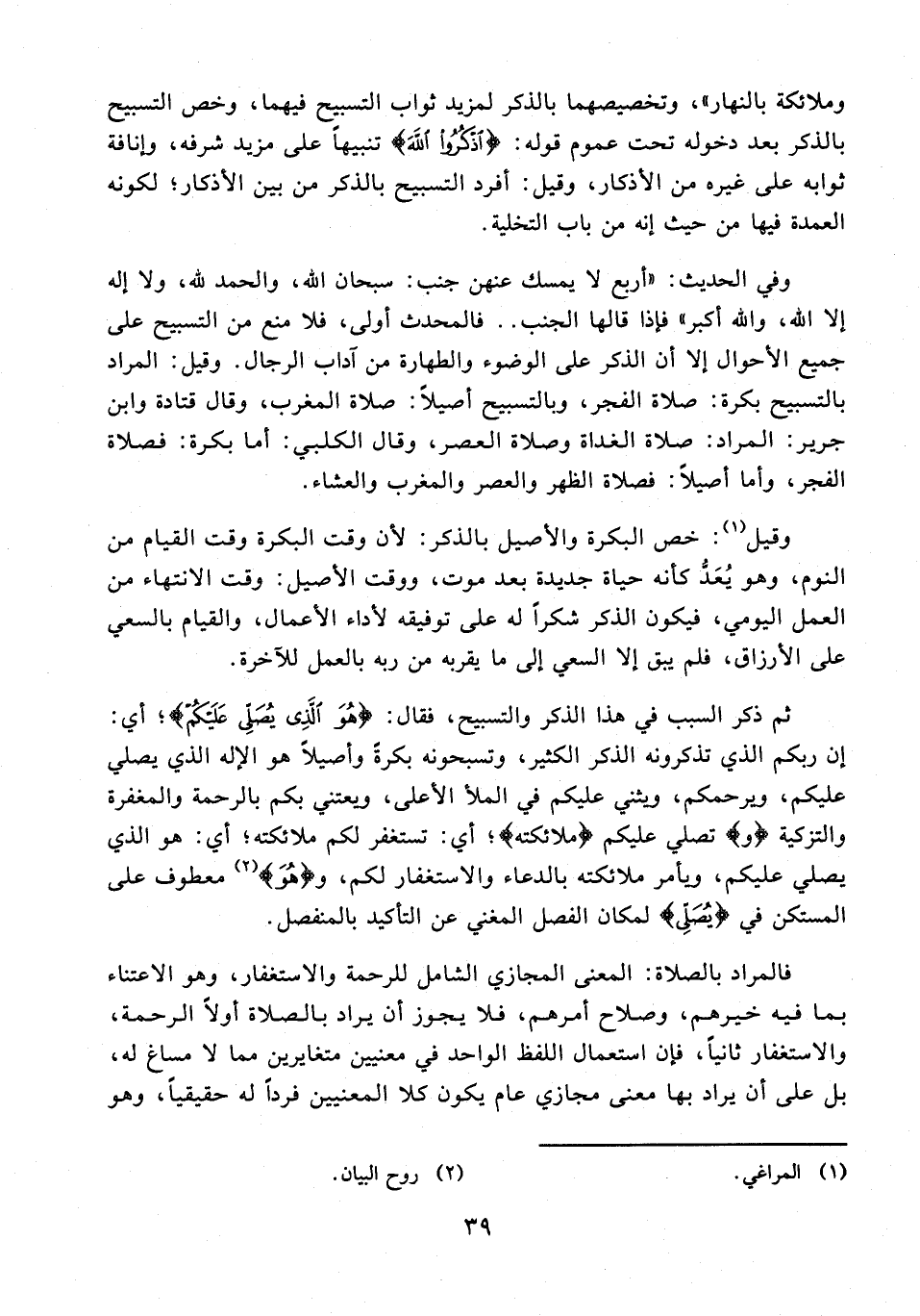 وفي الحديث: "أربع لا يمسك عنهن جنب: سبحان الله، والحمد لله، ولا إله إلا الله، والله أكبر" فإذا قالها الجنب .. فالمحدث أولى، فلا منع من التسبيح على جميع الأحوال إلا أن الذكر على الوضوء والطهارة من آداب الرجال. وقيل: المراد بالتسبيح بكرة: صلاة الفجر، وبالتسبيح أصيلًا: صلاة المغرب، وقال قتادة وابن جرير: المراد: صلاة الغداة وصلاة العصر، وقال الكلبي: أما بكرة: فصلاة الفجر، وأما أصيلًا: فصلاة الظهر والعصر والمغرب والعشاء.