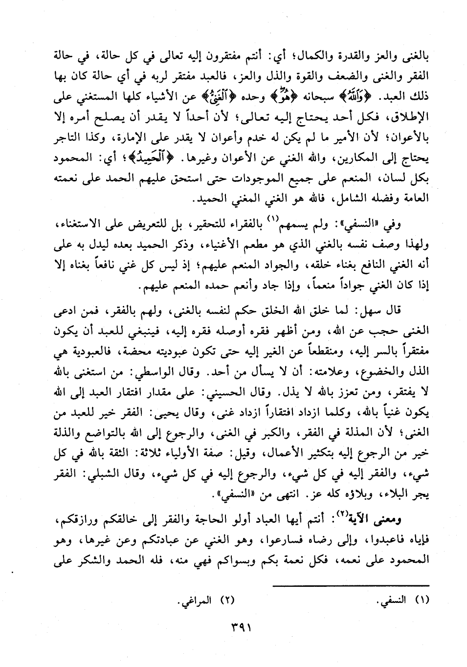 ومعنى الآية (¬2): أنتم أيها العباد أولو الحاجة والفقر إلى خالقكم ورازقكم، فإياه فاعبدوا، وإلى رضاه فسارعوا، وهو الغني عن عبادتكم وعن غيرها، وهو المحمود على نعمه، فكل نعمة بكم وبسواكم فهي منه، فله الحمد والشكر على