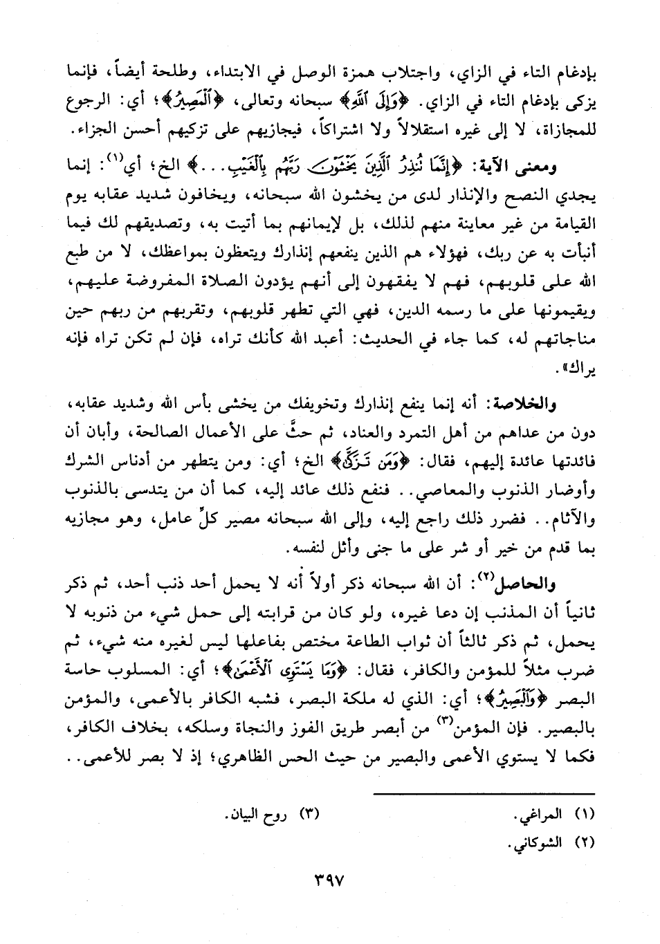 والخلاصة: أنه إنما ينفع إنذارك وتخويفك من يخشى بأس الله وشديد عقابه، دون من عداهم من أهل التمرد والعناد، ثم حثَّ على الأعمال الصالحة، وأبان أن فائدتها عائدة إليهم، فقال: {وَمَنْ تَزَكَّى} الخ؛ أي: ومن يتطهر من أدناس الشرك وأوضار الذنوب والمعاصي .. فنفع ذلك عائد إليه، كما أن من يتدسى بالذنوب والآثام .. فضرر ذلك راجع إليه، وإلى الله سبحانه مصير كلِّ عامل، وهو مجازيه بما قدم من خير أو شر على ما جنى وأثل لنفسه.
