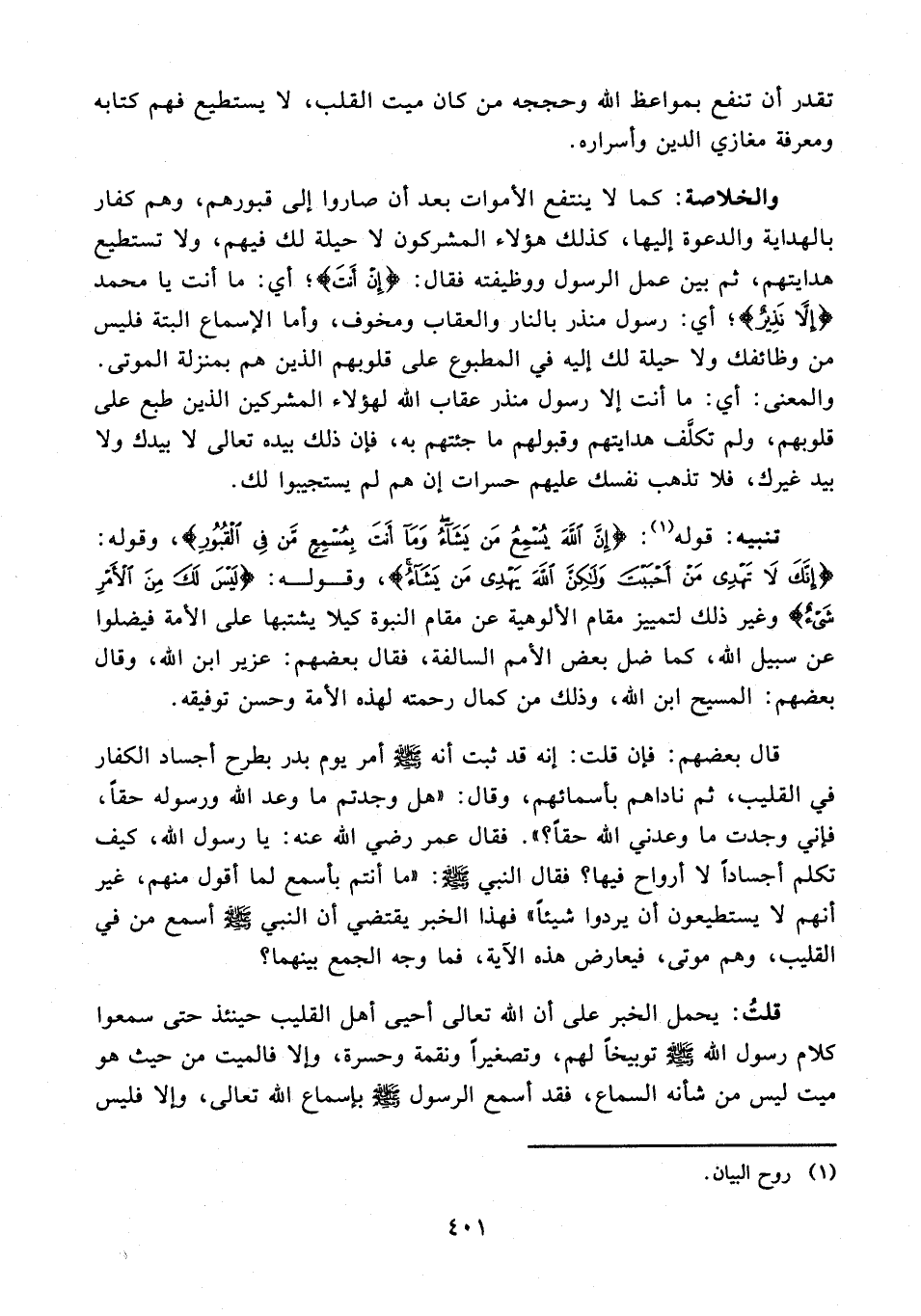 قال بعضهم: فإن قلت: إنه قد ثبت أنه - صلى الله عليه وسلم - أمر يوم بدر بطرح أجساد الكفار في القليب، ثم ناداهم بأسمائهم، وقال: "هل وجدتم ما وعد الله ورسوله حقًا، فإني وجدت ما وعدني الله حقًا؟ ". فقال عمر رضي الله عنه: يا رسول الله، كيف تكلم أجسادًا لا أرواح فيها؟ فقال النبي - صلى الله عليه وسلم -: "ما أنتم بأسمع لما أقول منهم، غير أنهم لا يستطيعون أن يردوا شيئًا" فهذا الخبر يقتضي أن النبي - صلى الله عليه وسلم - أسمع من في القليب، وهم موتى، فيعارض هذه الآية، فما وجه الجمع بينهما؟