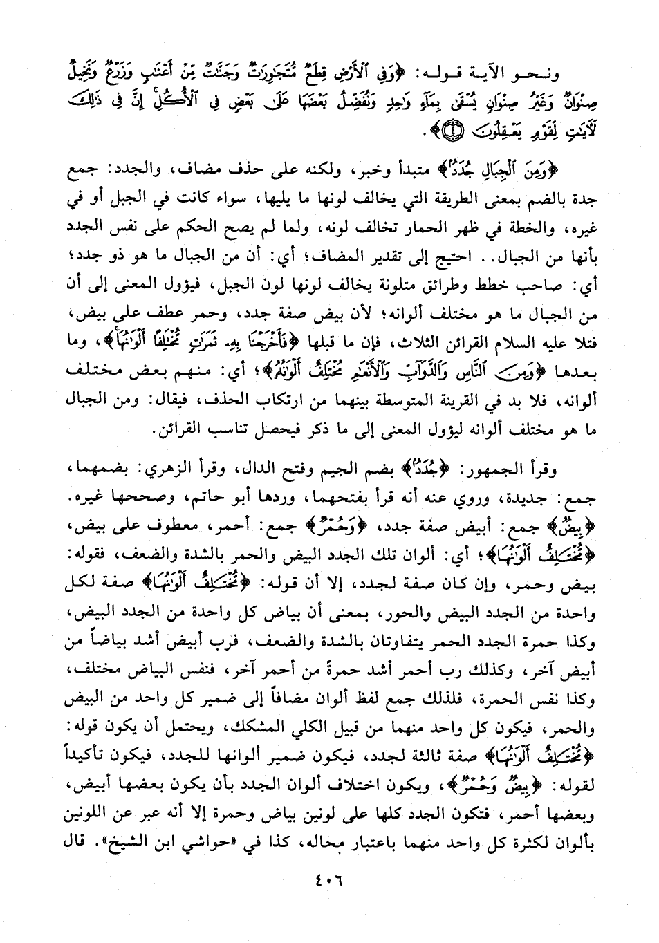 {وَمِنَ الْجِبَالِ جُدَدٌ} مبتدأ وخبر، ولكنه على حذف مضاف، والجدد: جمع جدة بالضم بمعنى الطريقة التي يخالف لونها ما يليها، سواء كانت في الجبل أو في غيره، والخطة في ظهر الحمار تخالف لونه، ولما لم يصح الحكم على نفس الجدد بأنها من الجبال .. احتيج إلى تقدير المضاف؛ أي: أن من الجبال ما هو ذو جدد؛ أي: صاحب خطط وطرائق متلونة يخالف لونها لون الجبل، فيؤول المعنى إلى أن من الجبال ما هو مختلف ألوانه؛ لأن بيض صفة جدد، وحمر عطف على بيض، فتلا عليه السلام القرائن الثلاث، فإن ما قبلها {فَأَخْرَجْنَا بِهِ ثَمَرَاتٍ مُخْتَلِفًا أَلْوَانُهَا}، وما بعدها {وَمِنَ النَّاسِ وَالدَّوَابِّ وَالْأَنْعَامِ مُخْتَلِفٌ أَلْوَانُهُ}؛ أي: منهم بعض مختلف ألوانه، فلا بد في القرينة المتوسطة بينهما من ارتكاب الحذف، فيقال: ومن الجبال ما هو مختلف ألوانه ليؤول المعنى إلى ما ذكر فيحصل تناسب القرائن.