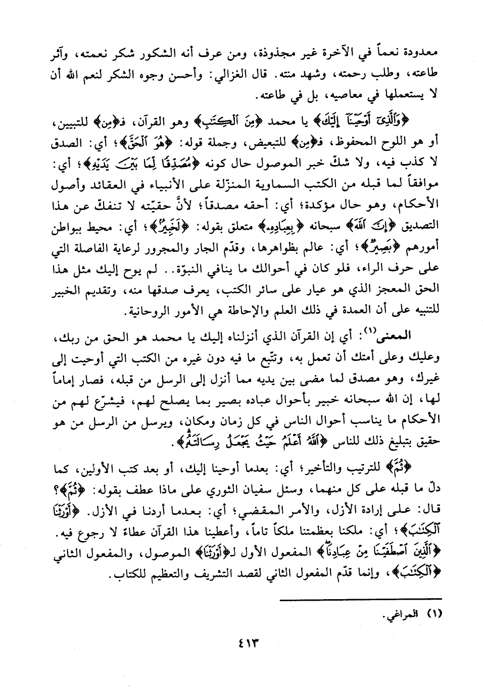المعنى (¬1): أي إن القرآن الذي أنزلناه إليك يا محمد هو الحق من ربك، وعليك وعلى أمتك أن نعمل به، وتتّبع ما فيه دون غيره من الكتب التي أوحيت إلى غيرك، وهو مصدق لما مضى بين يديه مما أنزل إلى الرسل من قبله، فصار إمامًا لها، إن الله سبحانه خبير بأحوال عباده بصير بما يصلح لهم، فيشرّع لهم من الأحكام ما يناسب أحوال الناس في كل زمان ومكان، ويرسل من الرسل من هو حقيق بتبليغ ذلك للناس {اللَّهُ أَعْلَمُ حَيْثُ يَجْعَلُ رِسَالَتَهُ}.