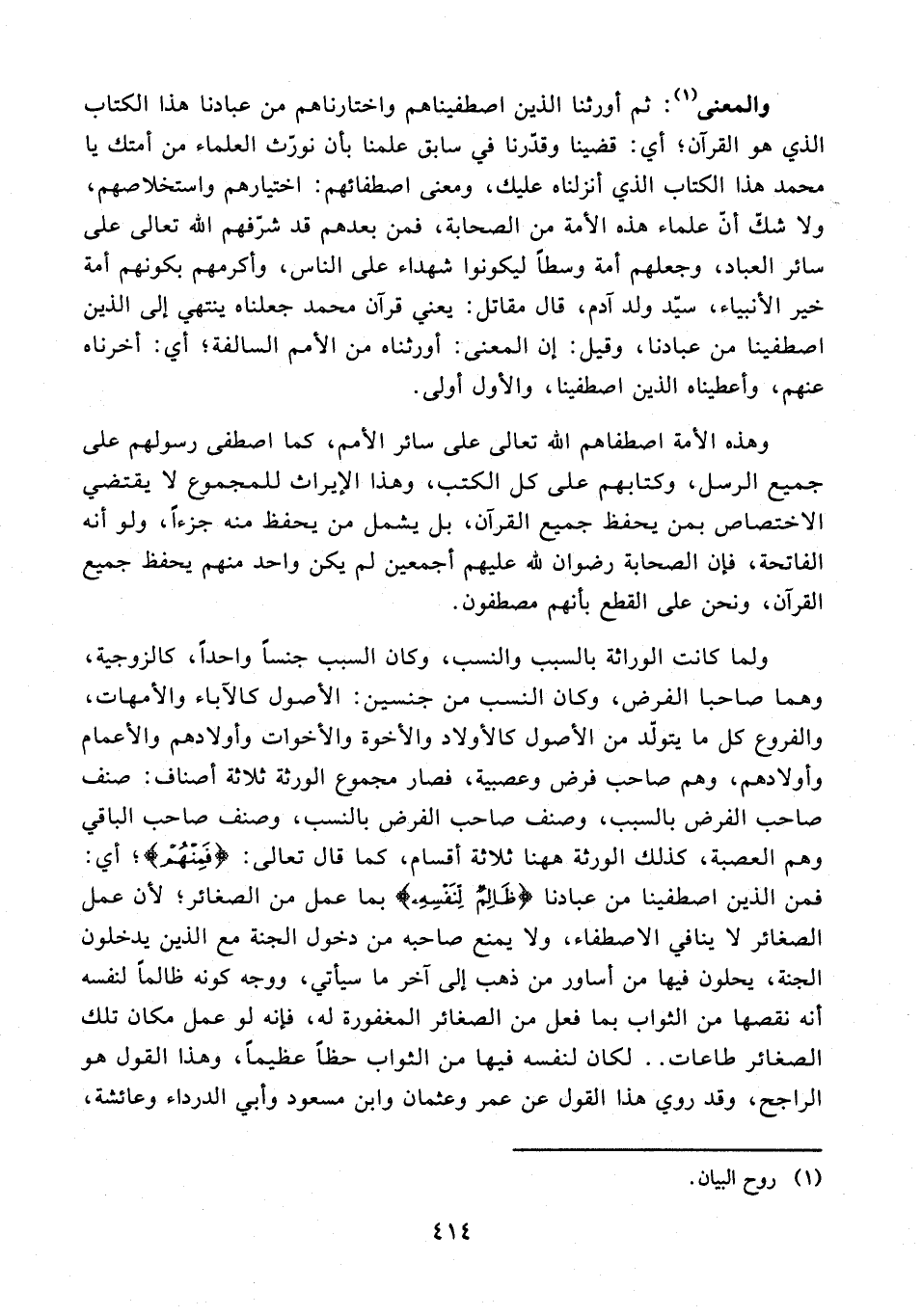 ولما كانت الوراثة بالسبب والنسب، وكان السبب جنسًا واحدًا، كالزوجية، وهما صاحبا الفرض، وكان النسب من جنسين: الأصول كالآباء والأمهات، والفروع كل ما يتولّد من الأصول كالأولاد والأخوة والأخوات وأولادهم والأعمام وأولادهم، وهم صاحب فرض وعصبية، فصار مجموع الورثة ثلاثة أصناف: صنف صاحب الفرض بالسبب، وصنف صاحب الفرض بالنسب، وصنف صاحب الباقي وهم العصبة، كذلك الورثة هاهنا ثلاثة أقسام، كما قال تعالى: {فَمِنْهُمْ}؛ أي: فمن الذين اصطفينا من عبادنا {ظَالِمٌ لِنَفْسِهِ} بما عمل من الصغائر؛ لأن عمل الصغائر لا ينافي الاصطفاء، ولا يمنع صاحبه من دخول الجنة مع الذين يدخلون الجنة، يحلون فيها من أساور من ذهب إلى آخر ما سيأتي، ووجه كونه ظالمًا لنفسه أنه نقصها من الثواب بما فعل من الصغائر المغفورة له، فإنه لو عمل مكان تلك الصغائر طاعات .. لكان لنفسه فيها من الثواب حظًا عظيمًا، وهذا القول هو الراجح، وقد روي هذا القول عن عمر وعثمان وابن مسعود وأبي الدرداء وعائشة،