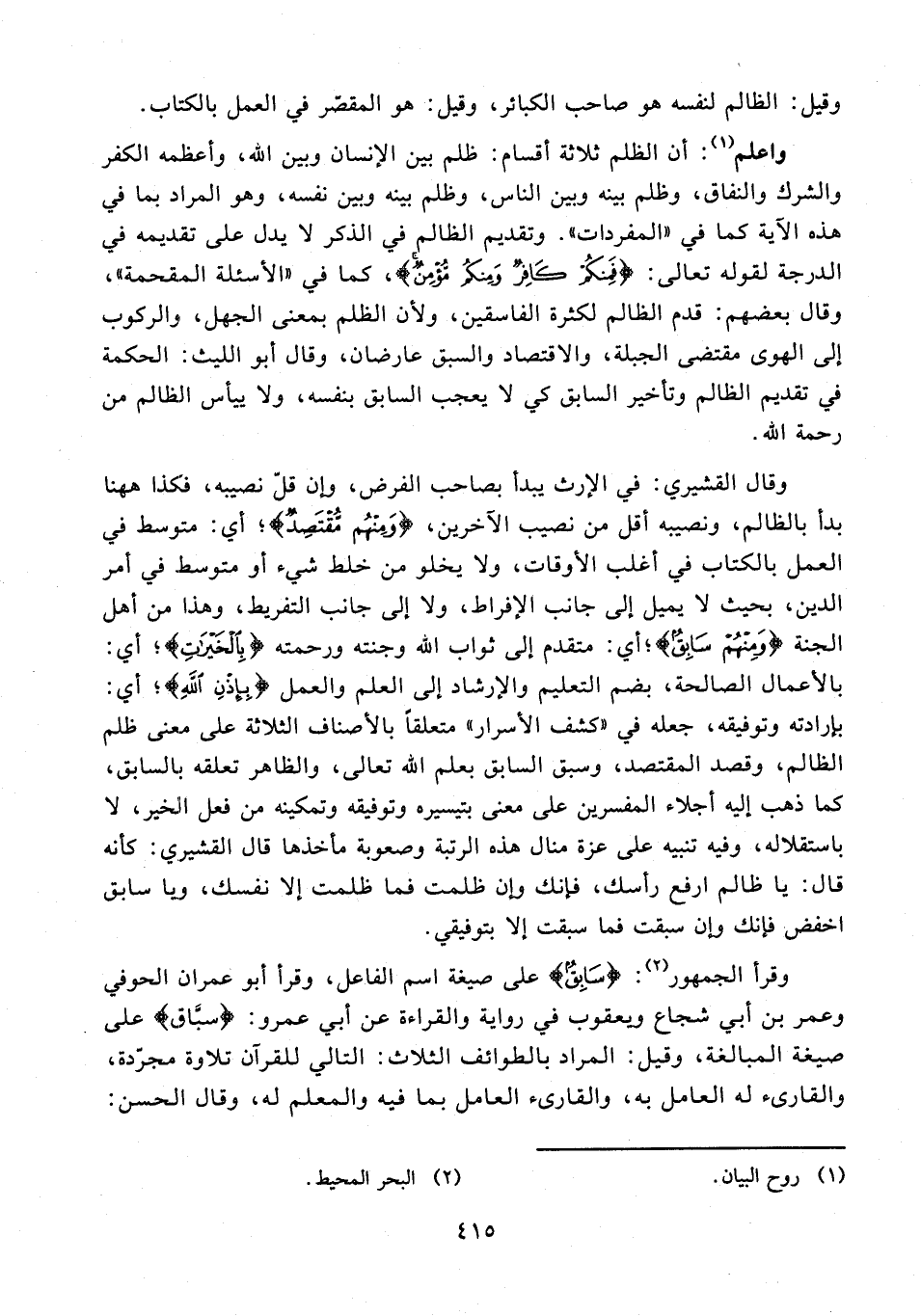 وقرأ الجمهور (¬2): {سَابِقٌ} على صيغة اسم الفاعل، وقرأ أبو عمران الحوفي وعمر بن أبي شجاع ويعقوب في رواية والقراءة عن أبي عمرو: {سبَّاق} على صيغة المبالغة، وقيل: المراد بالطوائف الثلاث: التالي للقرآن تلاوة مجرّدة، والقارىء له العامل به، والقارىء العامل بما فيه والمعلم له، وقال الحسن: