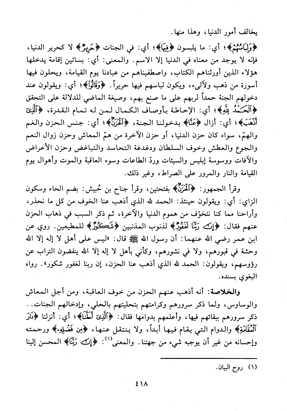 34 - {وَقَالُوا}؛ أي: ويقولون عند دخولهم الجنة حمدًا لربهم على ما صنع بهم، وصيغة الماضي للدلالة على التحقق {الْحَمْدُ لِلَّهِ}؛ أي: الإحاطة بأوصاف الكمال لمن له تمام القدرة، {الَّذِي أَذْهَبَ}؛ أي: أزال {عَنَّا} بدخولنا الجنة، {الْحَزَنَ}؛ أي: جنس الحزن والغم والهمّ، سواء كان حزن الدنيا، أو حزن الآخرة من همّ المعاش وحزن زوال النعم والجوع والعطش وخوف السلطان ودغدغة التحاسد والتباغض وحزن الأعراض والآفات ووسوسة إبليس والسيئات وردّ الطاعات وسوء العاقبة والموت وأهوال يوم القيامة والنار والمرور على الصراط، وغير ذلك.