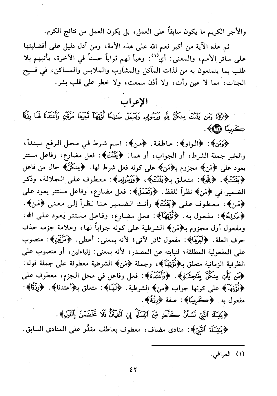 {وَمَن}: {الواو}: عاطفة. {من}: اسم شرط في محل الرفع مبتدأ، والخبر جملة الشرط، أو الجواب، أو هما. {يَقْنُتْ}: فعل مضارع، وفاعل مستتر يعود على {مَن} مجزوم بـ {مَن} على كونه فعل شرط لها. {مِنْكُنَّ} حال من فاعل {يَقْنُتْ}. {لِلَّهِ}: متعلق بـ {يَقْنُتْ}، {وَرَسُولِهِ}: معطوف على الجلالة، وذكر الضمير في {مَن} نظرًا للفظ. {وَتَعْمَلْ}: فعل مضارع، وفاعل مستتر يعود على {مَن}، معطوف على {يَقْنُتْ} وأنث الضمير هنا نظرًا إلى معنى {مَن}. {صَالِحًا}: مفعول به. {نُؤْتِهَا}: فعل مضارع، وفاعل مستتر يعود على الله، ومفعول أول مجزوم بـ {مَن} الشرطية على كونه جوابًا لها، وعلامة جزمه حذف حرف العلة. {أَجْرَهَا}: مفعول ثان لآتى؛ لأنه بمعنى: أعطى. {مَرَّتَيْنِ}: منصوب على المفعولية المطلقة؛ لنيابته عن المصدر؛ لأنه بمعنى: إتياءتين، أو منصوب على الظرفية الزمانية متعلق بـ {نُؤْتِهَا}، وجملة {مَن} الشرطية معطوفة على جملة قوله: {مَنْ يَأْتِ مِنْكُنَّ بِفَاحِشَةٍ}. {وَأَعْتَدْنَا}: فعل وفاعل في محل الجزم، معطوف على {نُؤْتِهَا} على كونها جواب {من} الشرطية. {لَهَا}: متعلق بـ {أَعْتَدْنَا}. {رِزْقًا}: مفعول به. {كَرِيمًا}: صفة {رِزْقًا}.