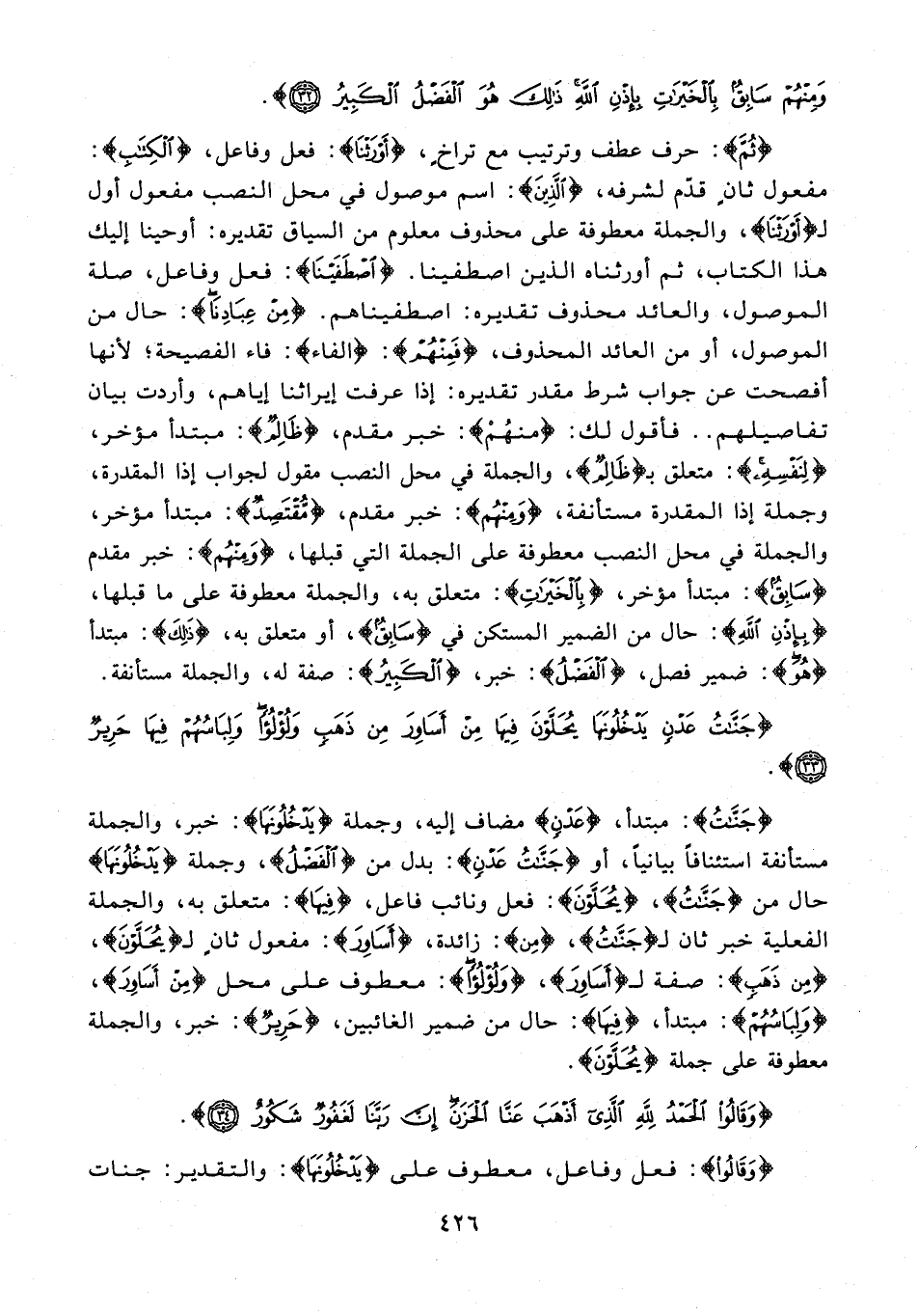 {ثُمَّ}: حرف عطف وترتيب مع تراخٍ، {أَوْرَثْنَا}: فعل وفاعل، {الْكِتَابَ}: مفعول ثانٍ قدّم لشرفه، {الَّذِينَ}: اسم موصول في محل النصب مفعول أول لـ {أَوْرَثْنَا}، والجملة معطوفة على محذوف معلوم من السياق تقديره: أوحينا إليك هذا الكتاب، ثم أورثناه الذين اصطفينا. {اصْطَفَيْنَا}: فعل وفاعل، صلة الموصول، والعائد محذوف تقديره: اصطفيناهم. {مِنْ عِبَادِنَا}: حال من الموصول، أو من العائد المحذوف، {فَمِنْهُمْ}: {الفاء}: فاء الفصيحة؛ لأنها أفصحت عن جواب شرط مقدر تقديره: إذا عرفت إيراثنا إياهم، وأردت بيان تفاصيلهم .. فأقول لك: {مِنْهُمْ}: خبر مقدم، {ظَالِمٌ}: مبتدأ مؤخر، {لِنَفْسِهِ}: متعلق بـ {ظَالِمٌ}، والجملة في محل النصب مقول لجواب إذا المقدرة، وجملة إذا المقدرة مستأنفة، {وَمِنْهُمْ}: خبر مقدم، {مُقْتَصِدٌ}: مبتدأ مؤخر، والجملة في محل النصب معطوفة على الجملة التي قبلها، {وَمِنْهُمْ}: خبر مقدم {سَابِقٌ}: مبتدأ مؤخر، {بِالْخَيْرَاتِ}: متعلق به، والجملة معطوفة على ما قبلها، {بِإِذْنِ اللَّهِ}: حال من الضمير المستكن في {سَابِقٌ}، أو متعلق به، {ذَلِكَ}: مبتدأ {هُوَ}: ضمير فصل، {الْفَضْلُ}: خبر، {الْكَبِيرُ}: صفة له، والجملة مستأنفة.