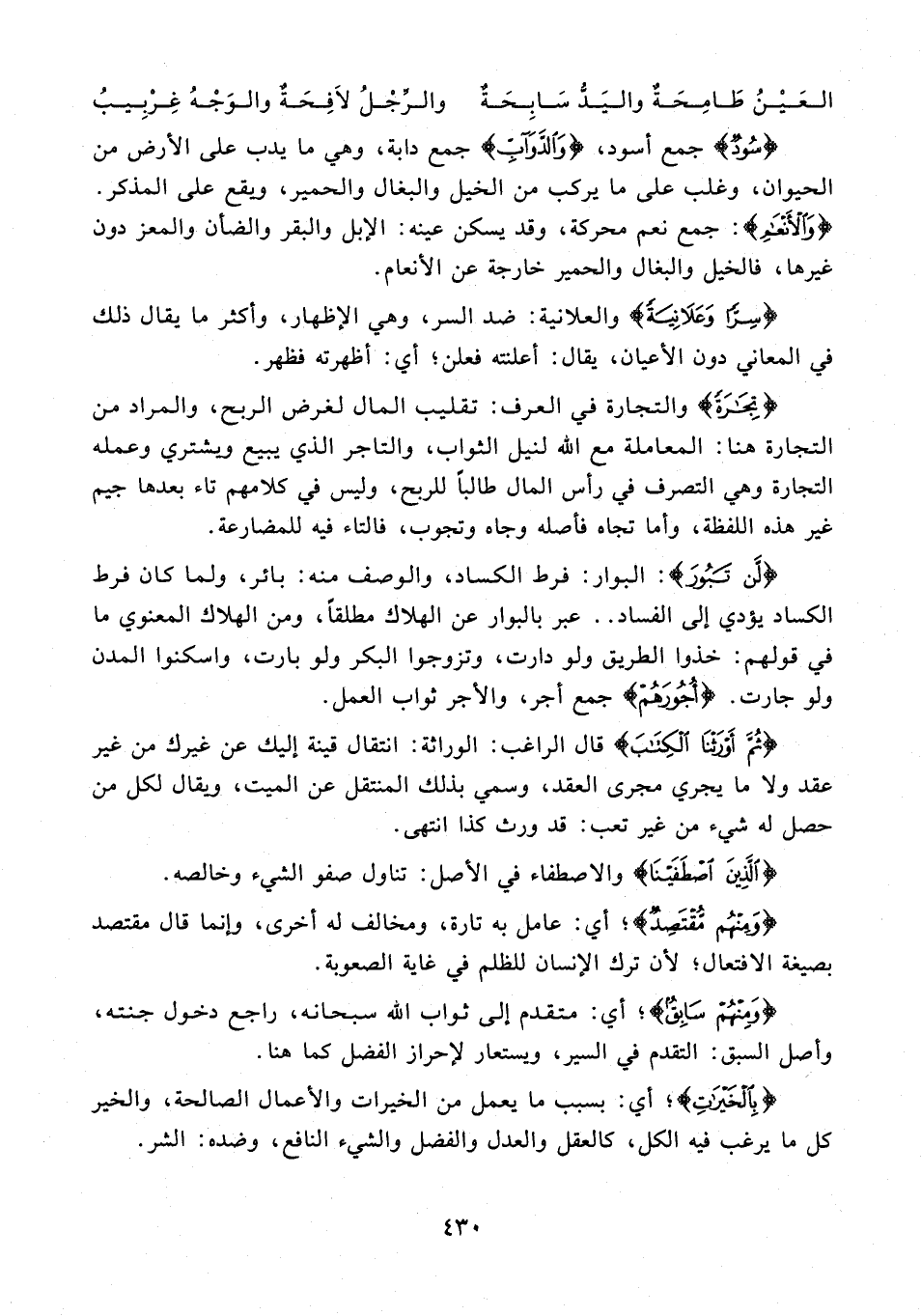 {لَنْ تَبُورَ}: البوار: فرط الكساد، والوصف منه: بائر، ولما كان فرط الكساد يؤدي إلى الفساد .. عبر بالبوار عن الهلاك مطلقًا، ومن الهلاك المعنوي ما في قولهم: خذوا الطريق ولو دارت، وتزوجوا البكر ولو بارت، واسكنوا المدن ولو جارت. {أُجُورَهُمْ} جمع أجر، والأجر ثواب العمل.