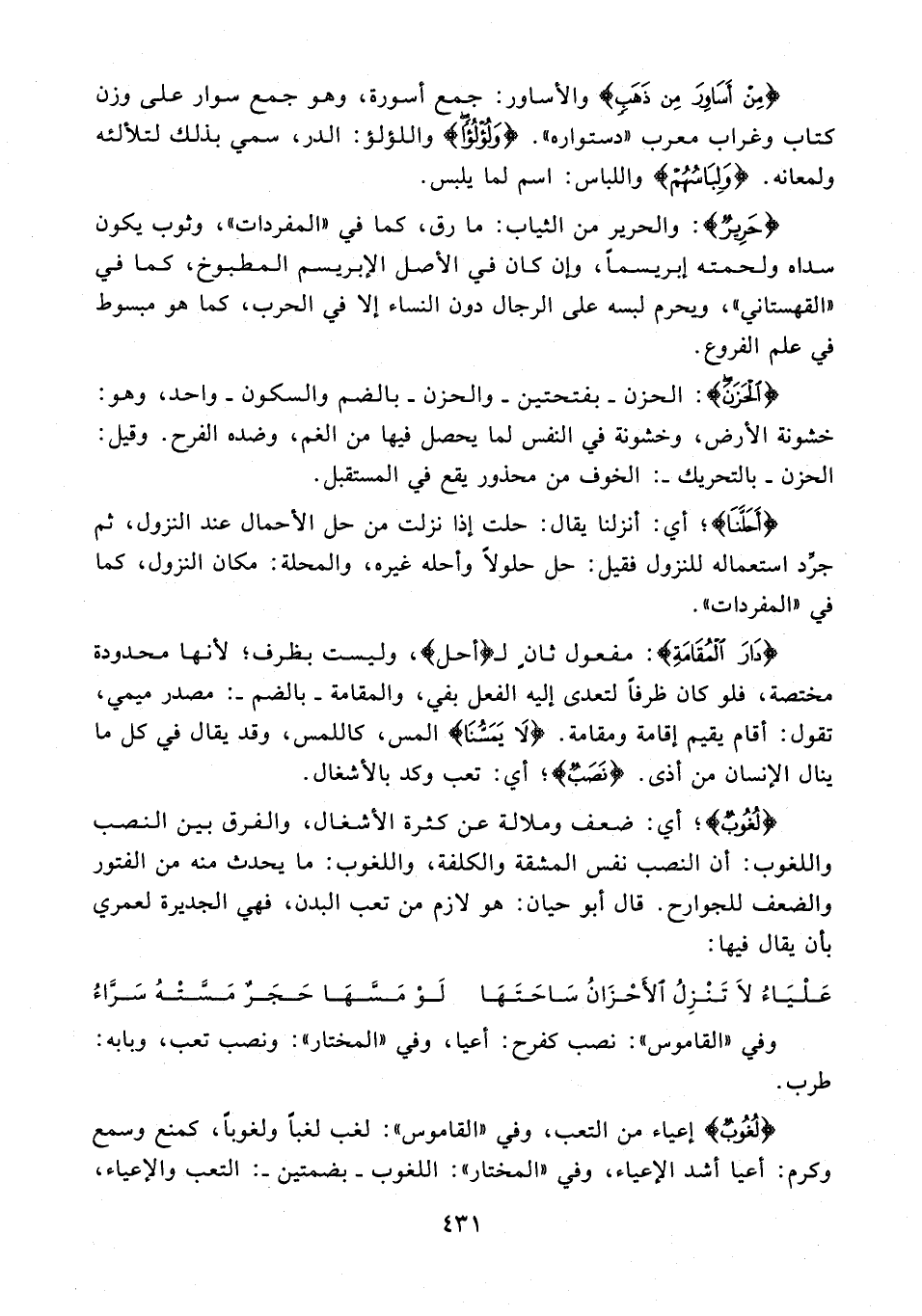 {مِنْ أَسَاوِرَ مِنْ ذَهَبٍ} والأساور: جمع أسورة، وهو جمع سوار على وزن كتاب وغراب معرب "دستواره". {وَلُؤْلُؤًا} واللؤلؤ: الدر، سمي بذلك لتلألئه ولمعانه. {وَلِبَاسُهُمْ} واللباس: اسم لما يلبس.