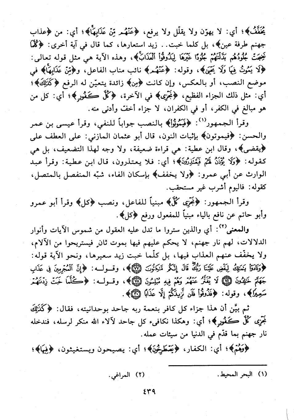 والمعنى (¬2): أي والذين ستروا ما تدل عليه العقول من شموس الآيات وأنوار الدلالات , لهم نار جهنم، لا يحكم عليهم فيها بموت ثانٍ فيستريحوا من الآلام، ولا يخفّف عنهم العذاب فيها، بل كلّما خبت زيد سعيرها، ونحو الآية قوله: {وَنَادَوْا يَا مَالِكُ لِيَقْضِ عَلَيْنَا رَبُّكَ قَالَ إِنَّكُمْ مَاكِثُونَ (77)}، وقوله: {إِنَّ الْمُجْرِمِينَ فِي عَذَابِ جَهَنَّمَ خَالِدُونَ (74) لَا يُفَتَّرُ عَنْهُمْ وَهُمْ فِيهِ مُبْلِسُونَ (75)}، وقوله: {كُلَّمَا خَبَتْ زِدْنَاهُمْ سَعِيرًا}، وقوله: {فَذُوقُوا فَلَنْ نَزِيدَكُمْ إِلَّا عَذَابًا (30)}.