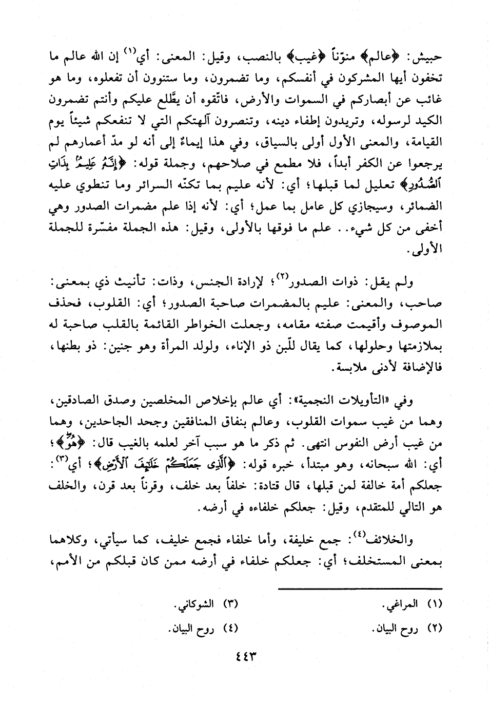 حبيش: {عالم} منوّنًا {غيب} بالنصب، وقيل: المعنى: أي (¬1) إن الله عالم ما تخفون أيها المشركون في أنفسكم، وما تضمرون، وما ستنوون أن تفعلوه، وما هو غائب عن أبصاركم في السموات والأرض، فاتّقوه أن يطَّلع عليكم وأنتم تضمرون الكيد لرسوله، وتريدون إطفاء دينه، وتنصرون آلهتكم التي لا تنفعكم شيئًا يوم القيامة، والمعنى الأول أولى بالسياق، وفي هذا إيماءٌ إلى أنه لو مدّ أعمارهم لم يرجعوا عن الكفر أبدًا، فلا مطمع في صلاحهم، وجملة قوله: {إِنَّهُ عَلِيمٌ بِذَاتِ الصُّدُورِ} تعليل لما قبلها؛ أي: لأنه عليم بما تكنّه السرائر وما تنطوي عليه الضمائر، وسيجازي كل عامل بما عمل؛ أي: لأنه إذا علم مضمرات الصدور وهي أخفى من كل شيء .. علم ما فوقها بالأولى، وقيل: هذه الجملة مفسّرة للجملة الأولى.