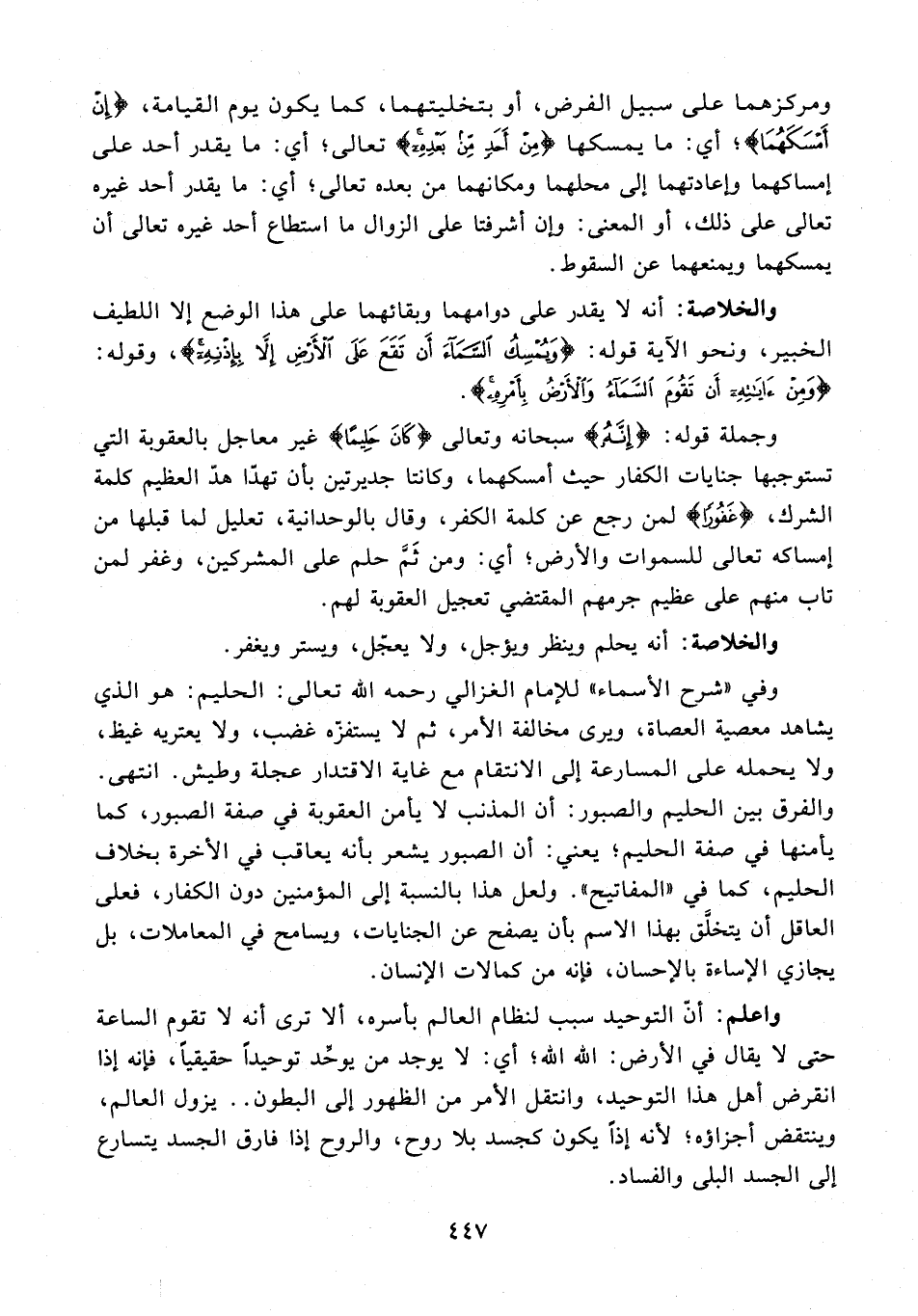 واعلم: أنّ التوحيد سبب لنظام العالم بأسره، ألا ترى أنه لا تقوم الساعة حتى لا يقال في الأرض: الله الله؛ أي: لا يوجد من يوحِّد توحيدًا حقيقيًا، فإنه إذا انقرض أهل هذا التوحيد، وانتقل الأمر من الظهور إلى البطون .. يزول العالم، وينتقض أجزاؤه؛ لأنه إذًا يكون كجسد بلا روح، والروح إذا فارق الجسد يتسارع إلى الجسد البلى والفساد.
