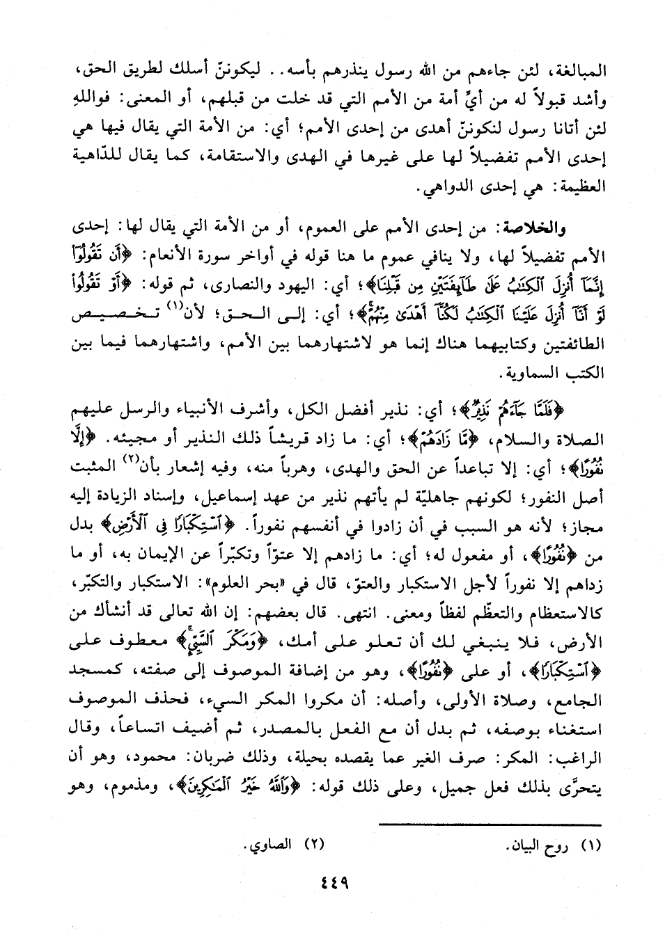 {فَلَمَّا جَاءَهُمْ نَذِيرٌ}؛ أي: نذير أفضل الكل، وأشرف الأنبياء والرسل عليهم الصلاة والسلام، {مَا زَادَهُمْ}؛ أي: ما زاد قريشًا ذلك النذير أو مجيئه. {إِلَّا نُفُورًا}؛ أي: إلا تباعدًا عن الحق والهدى، وهربًا منه، وفيه إشعار بأن (¬2) المثبت أصل النفور؛ لكونهم جاهليّة لم يأتهم نذير من عهد إسماعيل، وإسناد الزيادة إليه مجاز؛ لأنه هو السبب في أن زادوا في أنفسهم نفورًا.