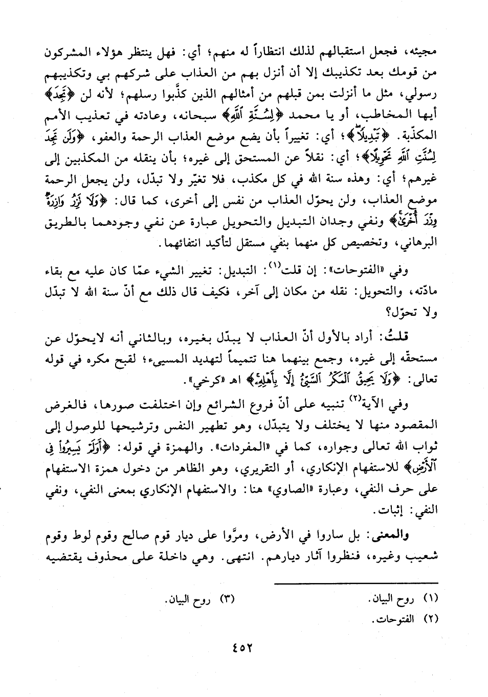 وفي "الفتوحات": إن قلت (¬1): التبديل: تغيير الشيء عمّا كان عليه مع بقاء مادّته، والتحويل: نقله من مكان إلى آخر، فكيف قال ذلك مع أنّ سنة الله لا تبدّل ولا تحوّل؟