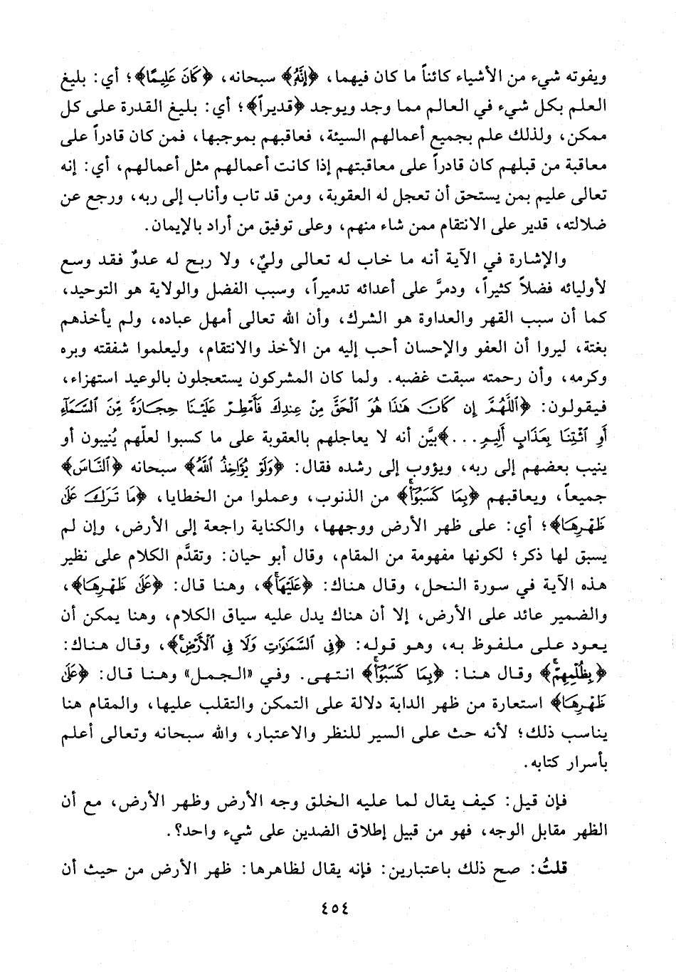 45 - ولما كان المشركون يستعجلون بالوعيد استهزاء، فيقولون: {اللَّهُمَّ إِنْ كَانَ هَذَا هُوَ الْحَقَّ مِنْ عِنْدِكَ فَأَمْطِرْ عَلَيْنَا حِجَارَةً مِنَ السَّمَاءِ أَوِ ائْتِنَا بِعَذَابٍ أَلِيمٍ ...} بيَّن أنه لا يعاجلهم بالعقوبة على ما كسبوا لعلّهم يُنيبون أو ينيب بعضهم إلى ربه، ويؤوب إلى رشده فقال: {وَلَوْ يُؤَاخِذُ اللَّهُ} سبحانه {النَّاسَ} جميعًا، ويعاقبهم {بِمَا كَسَبُوا} من الذنوب، وعملوا من الخطايا، {مَا تَرَكَ عَلَى ظَهْرِهَا}؛ أي: على ظهر الأرض ووجهها، والكناية راجعة إلى الأرض، وإن لم يسبق لها ذكر؛ لكونها مفهومة من المقام، وقال أبو حيان: وتقدَّم الكلام على نظير هذه الآية في سورة النحل، وقال هناك: {عَلَيْهَا}، وهنا قال: {عَلَى ظَهْرِهَا}، والضمير عائد على الأرض، إلا أن هناك يدل عليه سياق الكلام، وهنا يمكن أن يعود على ملفوظ به، وهو قوبه: {فِي السَّمَاوَاتِ وَلَا فِي الْأَرْضِ}، وقال هناك: {بِظُلْمِهِمْ} وقال هنا: {بِمَا كَسَبُوا} انتهى. وفي "الجمل" وهنا قال: {عَلَى ظَهْرِهَا} استعارة من ظهر الدابة دلالة على التمكن والتقلب عليها، والمقام هنا يناسب ذلك؛ لأنه حث على السير للنظر والاعتبار، والله سبحانه وتعالى أعلم بأسرار كتابه.
