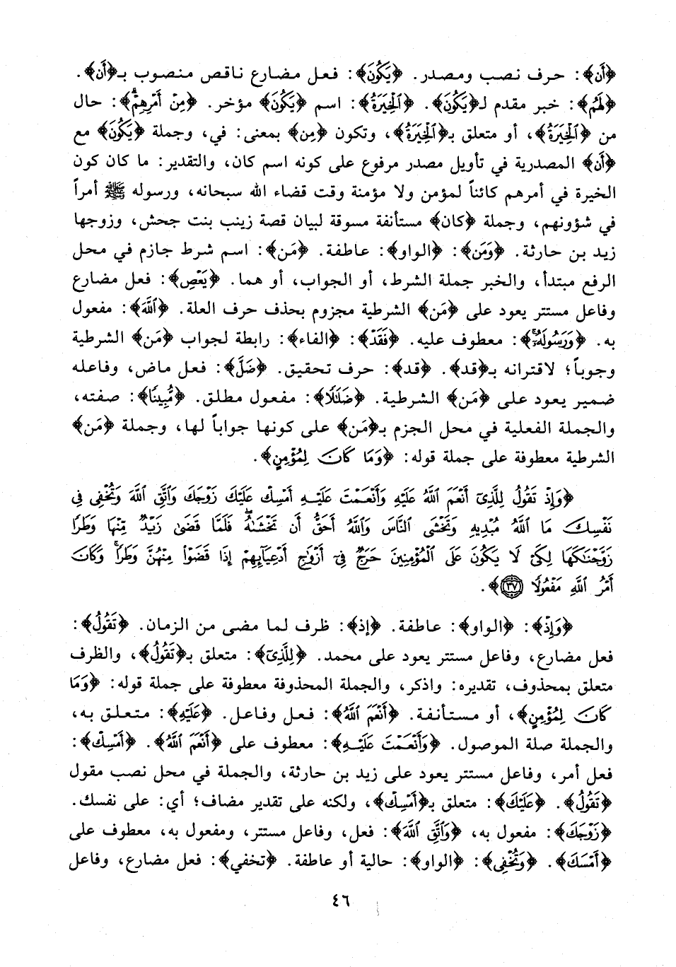 {أَن}: حرف نصب ومصدر. {يَكُونَ}: فعل مضارع ناقص منصوب بـ {أَنْ}. {لَهُمُ}: خبر مقدم لـ {يَكُونَ}. {الْخِيَرَةُ}: اسم {يَكُونَ} مؤخر. {مِنْ أَمْرِهِمْ}: حال من {الْخِيَرَةُ}، أو متعلق بـ {الْخِيَرَةُ}، وتكون {مِن} بمعنى: في، وجملة {يَكُونَ} مع {أَن} المصدرية في تأويل مصدر مرفوع على كونه اسم كان، والتقدير: ما كان كون الخيرة في أمرهم كائنًا لمؤمن ولا مؤمنة وقت قضاء الله سبحانه، ورسوله - صلى الله عليه وسلم - أمرًا في شؤونهم، وجملة {كان} مستأنفة مسوقة لبيان قصة زينب بنت جحش، وزوجها زيد بن حارثة. {وَمَن}: {الواو}: عاطفة. {مَن}: اسم شرط جازم في محل الرفع مبتدأ، والخبر جملة الشرط، أو الجواب، أو هما. {يَعْصِ}: فعل مضارع وفاعل مستتر يعود على {مَن} الشرطية مجزوم بحذف حرف العلة. {اللَّهَ}: مفعول به. {وَرَسُولَهُ}: معطوف عليه. {فَقَدْ}: {الفاء}: رابطة لجواب {مَن} الشرطية وجوبًا؛ لاقترانه بـ {قد}. {قد}: حرف تحقيق. {ضَلَّ}: فعل ماض، وفاعله ضمير يعود على {مَن} الشرطية. {ضَلَالًا}: مفعول مطلق. {مُبِينًا}: صفته، والجملة الفعلية في محل الجزم بـ {مَن} على كونها جوابًا لها، وجملة {مَن} الشرطية معطوفة على جملة قوله: {وَمَا كَانَ لِمُؤْمِنٍ}.