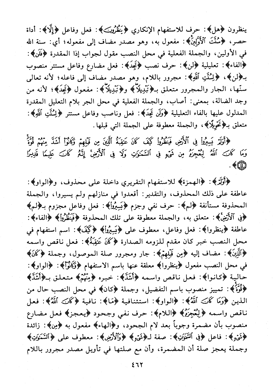 ينظرون {هل}: حرف للاستفهام الإنكاري {يَنْظُرُونَ}: فعل وفاعل {إِلَّا}: أداة حصر، {سُنَّتَ الْأَوَّلِينَ}: مفعول به، وهو مصدر مضاف إلى مفعوله؛ أي: سنة الله في الأولين، والجملة الفعلية في محل النصب مقول لجواب إذا المقدرة {فَلَنْ}: {الفاء}: تعليلية {لن}: حرف نصب {تَجِدَ}: فعل مضارع وفاعل مستتر منصوب بـ {لن}، {لِسُنَّتِ اللَّهِ}: مجرور باللام، وهو مصدر مضاف إلى فاعله؛ لأنه تعالى سنّها، الجار والمجرور متعلق بـ {تَبْدِيلًا} و {تَبْدِيلًا}: مفعول {تَجِدَ}؛ لأنه من وجد الضالة، بمعنى: أصاب، والجملة الفعلية في محل الجر بلام التعليل المقدرة المدلول عليها بالفاء التعليلية {وَلَنْ تَجِدَ}: فعل وناصب وفاعل مستتر {لِسُنَّتِ اللَّهِ}: متعلق بـ {تَحْوِيلًا}، والجملة معطوفة على الجملة التي قبلها.