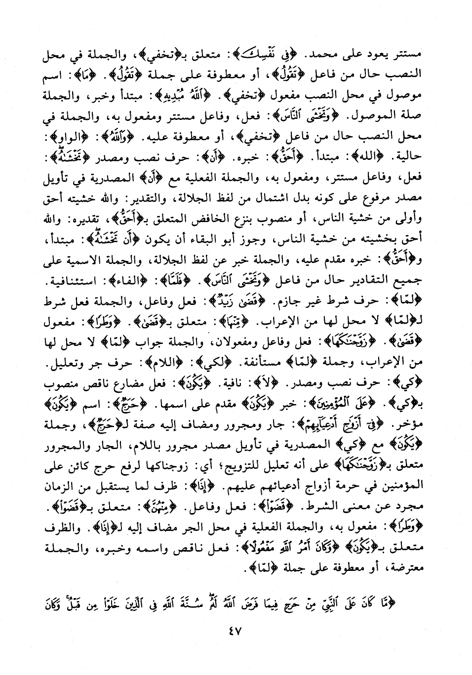 مستتر يعود على محمد. {فِي نَفْسِكَ}: متعلق بـ {تخفي}، والجملة في محل النصب حال من فاعل {تَقُولُ}، أو معطوفة على جملة {تَقُولُ}. {مَا}: اسم موصول في محل النصب مفعول {تخفي}. {اللَّهُ مُبْدِيهِ}: مبتدأ وخبر، والجملة صلة الموصول. {وَتَخْشَى النَّاسَ}: فعل، وفاعل مستتر ومفعول به، والجملة في محل النصب حال من فاعل {تخفي}، أو معطوفة عليه. {وَاللَّهُ}: {الواو}: حالية. {الله}: مبتدأ. {أَحَقُّ}: خبره. {أَنْ}: حرف نصب ومصدر {تَخْشَاهُ}: فعل، وفاعل مستتر، ومفعول به، والجملة الفعلية مع {أَن} المصدرية في تأويل مصدر مرفوع على كونه بدل اشتمال من لفظ الجلالة، والتقدير: والله خشيته أحق وأولى من خشية الناس، أو منصوب بنزع الخافض المتعلق بـ {أَحَقُّ}، تقديره: والله أحق بخشيته من خشية الناس، وجوز أبو البقاء أن يكون {أَنْ تَخْشَاهُ}: مبتدأ، و {أَحَقُّ}: خبره مقدم عليه، والجملة خبر عن لفظ الجلالة، والجملة الاسمية على جميع التقادير حال من فاعل {وَتَخْشَى النَّاسَ}. {فَلَمَّا}: {الفاء}: استئنافية. {لَمَّا}: حرف شرط غير جازم. {قَضَى زَيْدٌ}: فعل وفاعل، والجملة فعل شرط لـ {لمّا} لا محل لها من الإعراب. {مِنْهَا}: متعلق بـ {قَضَى}. {وَطَرًا}: مفعول {قَضَى}. {زَوَّجْنَاكَهَا}: فعل وفاعل ومفعولان, والجملة جواب {لمّا} لا محل لها من الإعراب، وجملة {لمّا} مستأنفة. {لكي}: {اللام}: حرف جر وتعليل. {كي}: حرف نصب ومصدر. {لَا}: نافية. {يَكُونَ}: فعل مضارع ناقص منصوب بـ {كي}. {عَلَى الْمُؤْمِنِينَ}: خبر {يَكُونَ} مقدم على اسمها. {حَرَجٌ}: اسم {يَكُونَ} مؤخر. {فِي أَزْوَاجِ أَدْعِيَائِهِمْ}: جار ومجرور ومضاف إليه صفة لـ {حَرَجٌ}، وجملة {يَكُونَ} مع {كي} المصدرية في تأويل مصدر مجرور باللام، الجار والمجرور متعلق بـ {زَوَّجْنَاكَهَا} على أنه تعليل للتزويج؛ أي: زوجناكها لرفع حرج كائن على المؤمنين في حرمة أزواج أدعيائهم عليهم. {إِذَا}: ظرف لما يستقبل من الزمان مجرد عن معنى الشرط. {قَضَوْا}: فعل وفاعل. {مِنْهُنَّ}: متعلق بـ {قَضَوْا}. {وَطَرًا}: مفعول به، والجملة الفعلية في محل الجر مضاف إليه لـ {إِذَا}. والظرف متعلق بـ {يَكُونَ} {وَكَانَ أَمْرُ اللَّهِ مَفْعُولًا}: فعل ناقص واسمه وخبره، والجملة معترضة، أو معطوفة على جملة {لمّا}.