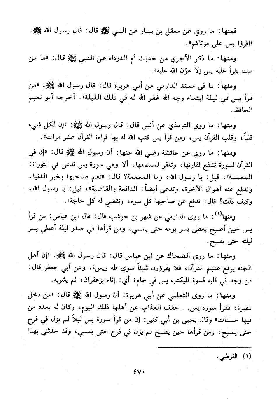 ومنها: ما روى الثعلبي عن أبي هريرة: أن رسول الله - صلى الله عليه وسلم - قال: "من دخل مقبرة، فقرأ سورة يس .. خفف العذاب عن أهلها ذلك اليوم، وكان له بعدد من فيها حسنات" وقال يحيى بن أبي كثير: إن من قرأ سورة يس ليلًا لم يزل في فرح حتى يصبح، ومن قرأها حين يصبح لم يزل في فرح حتى يمسي، وقد حدثني بهذا