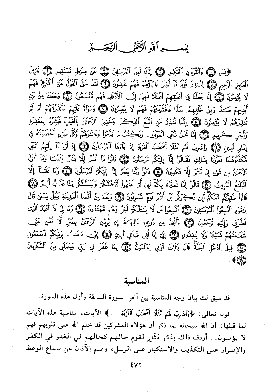 {يس (1) وَالْقُرْآنِ الْحَكِيمِ (2) إِنَّكَ لَمِنَ الْمُرْسَلِينَ (3) عَلَى صِرَاطٍ مُسْتَقِيمٍ (4) تَنْزِيلَ الْعَزِيزِ الرَّحِيمِ (5) لِتُنْذِرَ قَوْمًا مَا أُنْذِرَ آبَاؤُهُمْ فَهُمْ غَافِلُونَ (6) لَقَدْ حَقَّ الْقَوْلُ عَلَى أَكْثَرِهِمْ فَهُمْ لَا يُؤْمِنُونَ (7) إِنَّا جَعَلْنَا فِي أَعْنَاقِهِمْ أَغْلَالًا فَهِيَ إِلَى الْأَذْقَانِ فَهُمْ مُقْمَحُونَ (8) وَجَعَلْنَا مِنْ بَيْنِ أَيْدِيهِمْ سَدًّا وَمِنْ خَلْفِهِمْ سَدًّا فَأَغْشَيْنَاهُمْ فَهُمْ لَا يُبْصِرُونَ (9) وَسَوَاءٌ عَلَيْهِمْ أَأَنْذَرْتَهُمْ أَمْ لَمْ تُنْذِرْهُمْ لَا يُؤْمِنُونَ (10) إِنَّمَا تُنْذِرُ مَنِ اتَّبَعَ الذِّكْرَ وَخَشِيَ الرَّحْمَنَ بِالْغَيْبِ فَبَشِّرْهُ بِمَغْفِرَةٍ وَأَجْرٍ كَرِيمٍ (11) إِنَّا نَحْنُ نُحْيِ الْمَوْتَى وَنَكْتُبُ مَا قَدَّمُوا وَآثَارَهُمْ وَكُلَّ شَيْءٍ أَحْصَيْنَاهُ فِي إِمَامٍ مُبِينٍ (12) وَاضْرِبْ لَهُمْ مَثَلًا أَصْحَابَ الْقَرْيَةِ إِذْ جَاءَهَا الْمُرْسَلُونَ (13) إِذْ أَرْسَلْنَا إِلَيْهِمُ اثْنَيْنِ فَكَذَّبُوهُمَا فَعَزَّزْنَا بِثَالِثٍ فَقَالُوا إِنَّا إِلَيْكُمْ مُرْسَلُونَ (14) قَالُوا مَا أَنْتُمْ إِلَّا بَشَرٌ مِثْلُنَا وَمَا أَنْزَلَ الرَّحْمَنُ مِنْ شَيْءٍ إِنْ أَنْتُمْ إِلَّا تَكْذِبُونَ (15) قَالُوا رَبُّنَا يَعْلَمُ إِنَّا إِلَيْكُمْ لَمُرْسَلُونَ (16) وَمَا عَلَيْنَا إِلَّا الْبَلَاغُ الْمُبِينُ (17) قَالُوا إِنَّا تَطَيَّرْنَا بِكُمْ لَئِنْ لَمْ تَنْتَهُوا لَنَرْجُمَنَّكُمْ وَلَيَمَسَّنَّكُمْ مِنَّا عَذَابٌ أَلِيمٌ (18) قَالُوا طَائِرُكُمْ مَعَكُمْ أَئِنْ ذُكِّرْتُمْ بَلْ أَنْتُمْ قَوْمٌ مُسْرِفُونَ (19) وَجَاءَ مِنْ أَقْصَى الْمَدِينَةِ رَجُلٌ يَسْعَى قَالَ يَا قَوْمِ اتَّبِعُوا الْمُرْسَلِينَ (20) اتَّبِعُوا مَنْ لَا يَسْأَلُكُمْ أَجْرًا وَهُمْ مُهْتَدُونَ (21) وَمَا لِيَ لَا أَعْبُدُ الَّذِي فَطَرَنِي وَإِلَيْهِ تُرْجَعُونَ (22) أَأَتَّخِذُ مِنْ دُونِهِ آلِهَةً إِنْ يُرِدْنِ الرَّحْمَنُ بِضُرٍّ لَا تُغْنِ عَنِّي شَفَاعَتُهُمْ شَيْئًا وَلَا يُنْقِذُونِ (23) إِنِّي إِذًا لَفِي ضَلَالٍ مُبِينٍ (24) إِنِّي آمَنْتُ بِرَبِّكُمْ فَاسْمَعُونِ (25) قِيلَ ادْخُلِ الْجَنَّةَ قَالَ يَا لَيْتَ قَوْمِي يَعْلَمُونَ (26) بِمَا غَفَرَ لِي رَبِّي وَجَعَلَنِي مِنَ الْمُكْرَمِينَ (27)}.