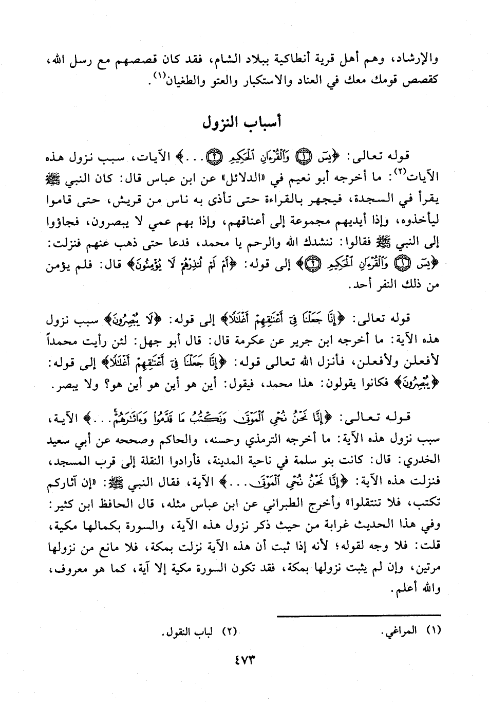 قوله تعالى: {يس (1) وَالْقُرْآنِ الْحَكِيمِ (2) ...} الآيات، سبب نزول هذه الآيات (¬2): ما أخرجه أبو نعيم في "الدلائل" عن ابن عباس قال: كان النبي - صلى الله عليه وسلم - يقرأ في السجدة، فيجهر بالقراءة حتى تأذى به ناس من قريش، حتى قاموا ليأخذوه، وإذا أيديهم مجموعة إلى أعناقهم، وإذا بهم عمي لا يبصرون، فجاؤوا إلى النبي - صلى الله عليه وسلم - فقالوا: ننشدك الله والرحم يا محمد، فدعا حتى ذهب عنهم فنزلت: {يس (1) وَالْقُرْآنِ الْحَكِيمِ (2)} إلى قوله: {أَمْ لَمْ تُنْذِرْهُمْ لَا يُؤْمِنُونَ} قال: فلم يؤمن من ذلك النفر أحد.