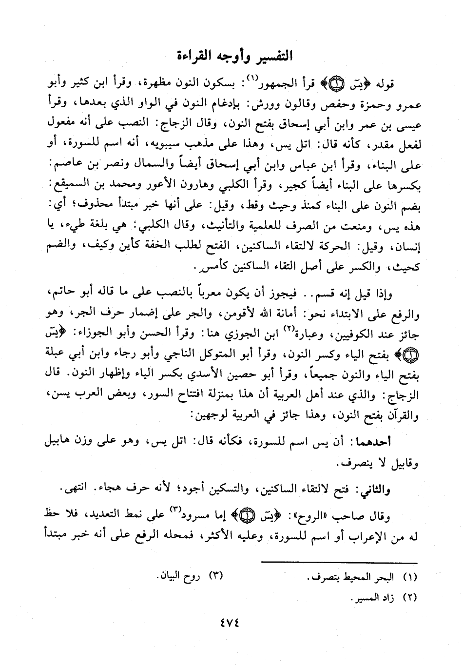 1 - قوله {يس (1)} قرأ الجمهور (¬1): بسكون النون مظهرة، وقرأ ابن كثير وأبو عمرو وحمزة وحفص وقالون وورش: بإدغام النون في الواو الذي بعدها، وقرأ عيسى بن عمر وابن أبي إسحاق بفتح النون، وقال الزجاج: النصب على أنه مفعول لفعل مقدر، كأنه قال: اتل يس، وهذا على مذهب سيبويه، أنه اسم للسورة، أو على البناء، وقرأ ابن عباس وابن أبي إسحاق أيضًا والسمال ونصر بن عاصم: بكسرها على البناء أيضًا كجير، وقرأ الكلبي وهارون الأعور ومحمد بن السميقع: بضم النون على البناء كمنذ وحيث وقط، وقيل: على أنها خبر مبتدأ محذوف؛ أي: هذه يس، ومنعت من الصرف للعلمية والتأنيث، وقال الكلبي: هي بلغة طيء، يا إنسان، وقيل: الحركة لالتقاء الساكنين، الفتح لطلب الخفة كأين وكيف، والضم كحيث، والكسر على أصل التقاء الساكنين كأمسِ.