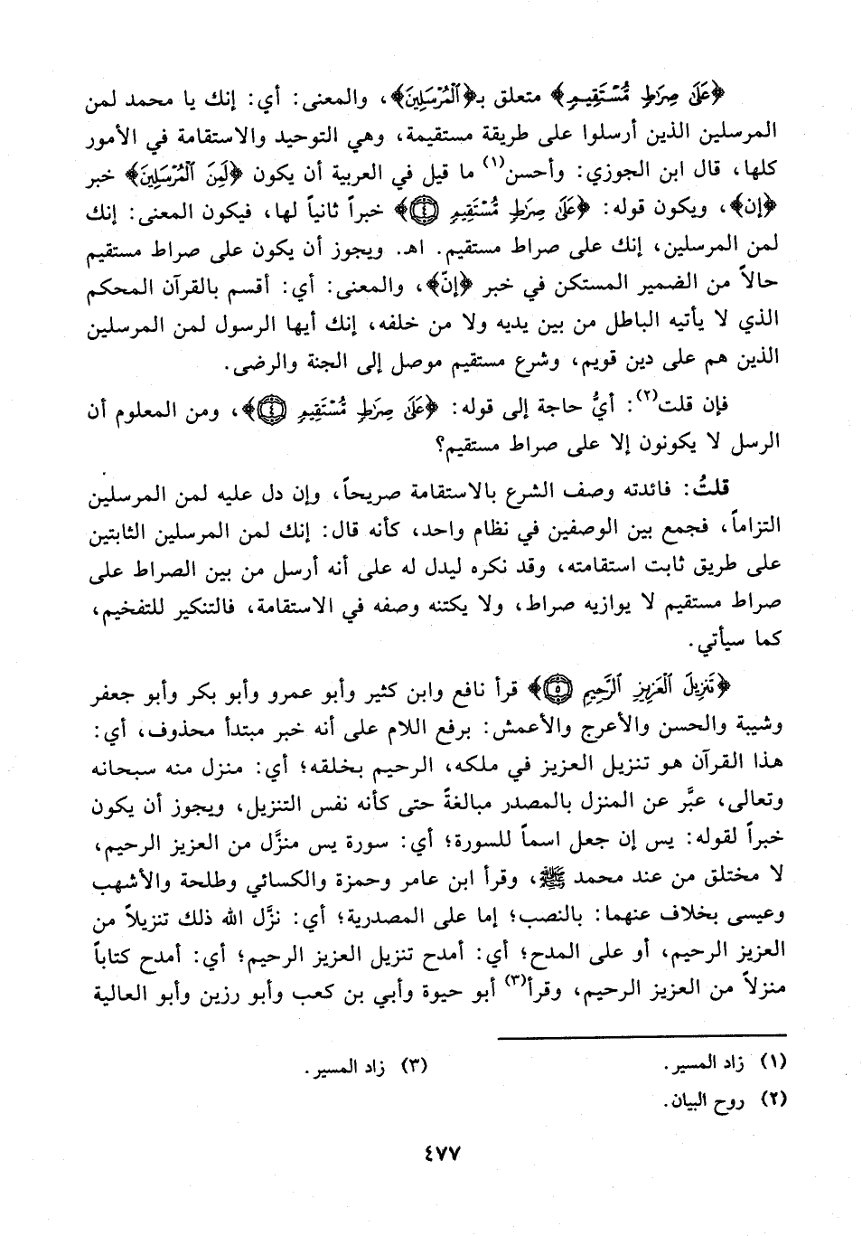 4 - {عَلَى صِرَاطٍ مُسْتَقِيمٍ} متعلق بـ {الْمُرْسَلِينَ}، والمعنى: أي: إنك يا محمد لمن المرسلين الذين أرسلوا على طريقة مستقيمة، وهي التوحيد والاستقامة في الأمور كلها، قال ابن الجوزي: وأحسن (¬1) ما قيل في العربية أن يكون {لَمِنَ الْمُرْسَلِينَ} خبر {إن}، ويكون قوله: {عَلَى صِرَاطٍ مُسْتَقِيمٍ (4)} خبرًا ثانيًا لها، فيكون المعنى: إنك لمن المرسلين، إنك على صراط مستقيم. اهـ. ويجوز أن يكون على صراط مستقيم حالًا من الضمير المستكن في خبر {إِنّ}، والمعنى: أي: أقسم بالقرآن المحكم الذي لا يأتيه الباطل من بين يديه ولا من خلفه، إنك أيها الرسول لمن المرسلين الذين هم على دين قويم، وشرع مستقيم موصل إلى الجنة والرضى.