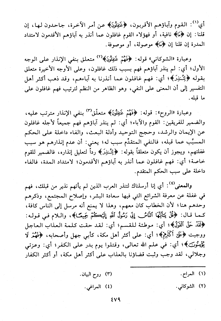 وعبارة "الروح": قوله: {فَهُمْ غَافِلُونَ} متعلّق (¬3) بنفي الإنذار مترتب عليه، والضمير للفريقين: القوم والآباء؛ أي: لم ينذر آباؤهم فهم جميعًا لأجله غافلون عن الإيمان والرشد، وحجج التوحيد وأدلة البعث، والفاء داخلة على الحكم المسبَّب عما قبله، فالنفي المتقدِّم سبب له؛ يعني: أن عدم إنذارهم هو سبب غفلتهم، ويجوز أن يكون متعلقًا بقوله: {لِتُنْذِرَ} ردًا لتعليل إنذاره، فالضمير للقوم خاصة؛ أي: فهم غافلون عما أنذر به آباؤهم الأقدمون؛ لامتداد المدة، فالفاء داخلة على سبب الحكم المتقدم.