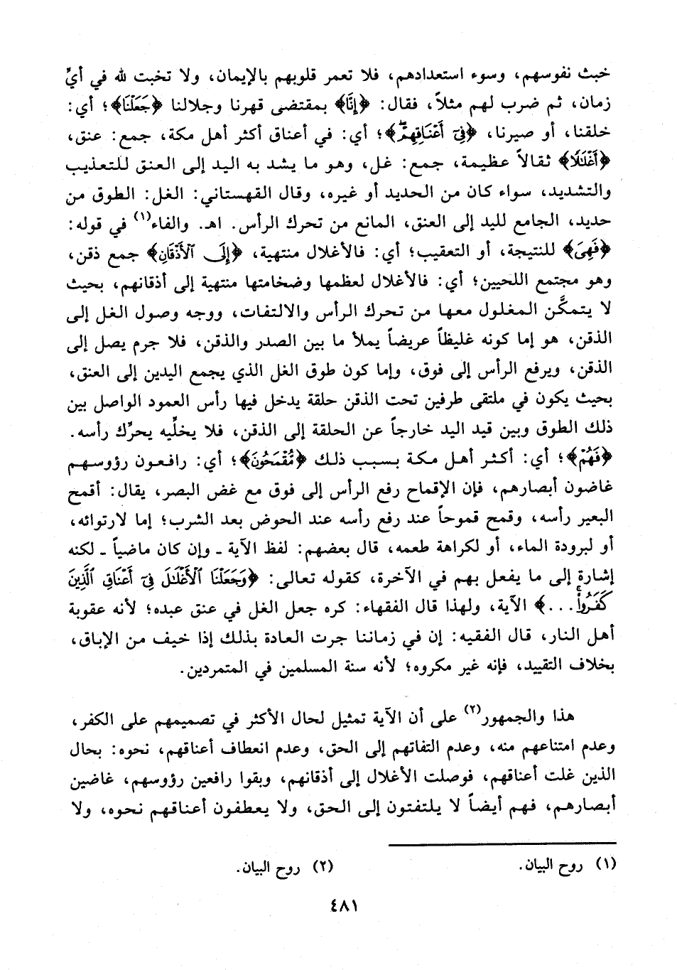 هذا والجمهور (¬2) على أن الآية تمثيل لحال الأكثر في تصميمهم على الكفر، وعدم امتناعهم منه، وعدم التفاتهم إلى الحق، وعدم انعطاف أعناقهم، نحوه: بحال الذين غلت أعناقهم، فوصلت الأغلال إلى أذقانهم، وبقوا رافعين رؤوسهم، غاضين أبصارهم، فهم أيضًا لا يلتفتون إلى الحق، ولا يعطفون أعناقهم نحوه، ولا