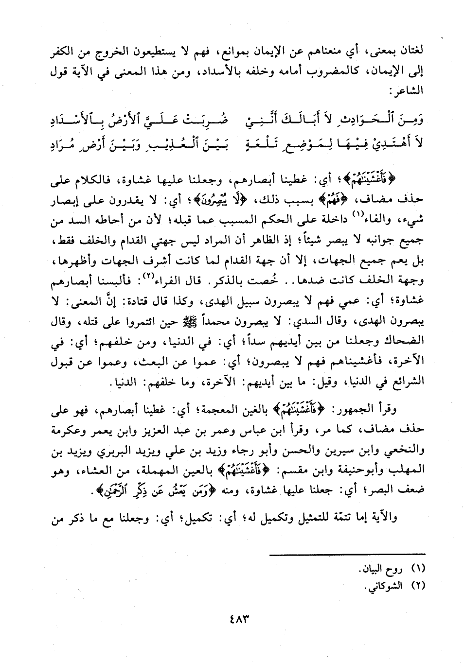 لغتان بمعنى، أي منعناهم عن الإيمان بموانع، فهم لا يستطيعون الخروج من الكفر إلى الإيمان, كالمضروب أمامه وخلفه بالأسداد، ومن هذا المعنى في الآية قول الشاعر: