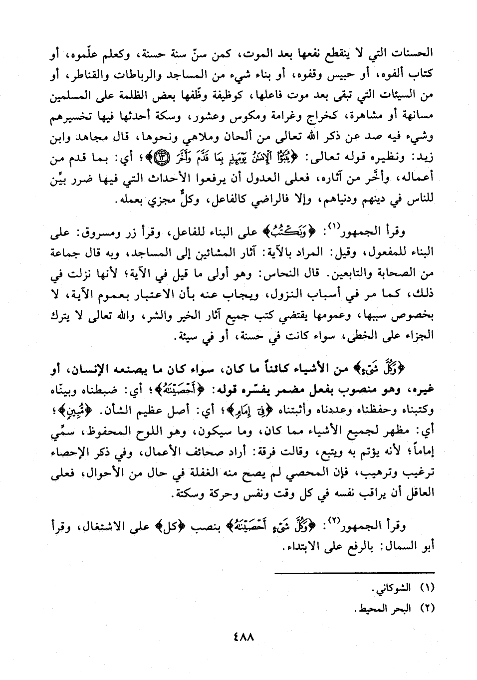 وقرأ الجمهور (¬1): {وَنَكْتُبُ} على البناء للفاعل، وقرأ زر ومسروق: على البناء للمفعول، وقيل: المراد بالآية: آثار المشائين إلى المساجد، وبه قال جماعة من الصحابة والتابعين. قال النحاس: وهو أولى ما قيل في الآية؛ لأنها نزلت في ذلك، كما مر في أسباب النزول، ويجاب عنه بأن الاعتبار بعموم الآية، لا بخصوص سببها، وعمومها يقتضي كتب جميع آثار الخير والشر، والله تعالى لا يترك الجزاء على الخطى، سواء كانت في حسنة، أو في سيئة.
