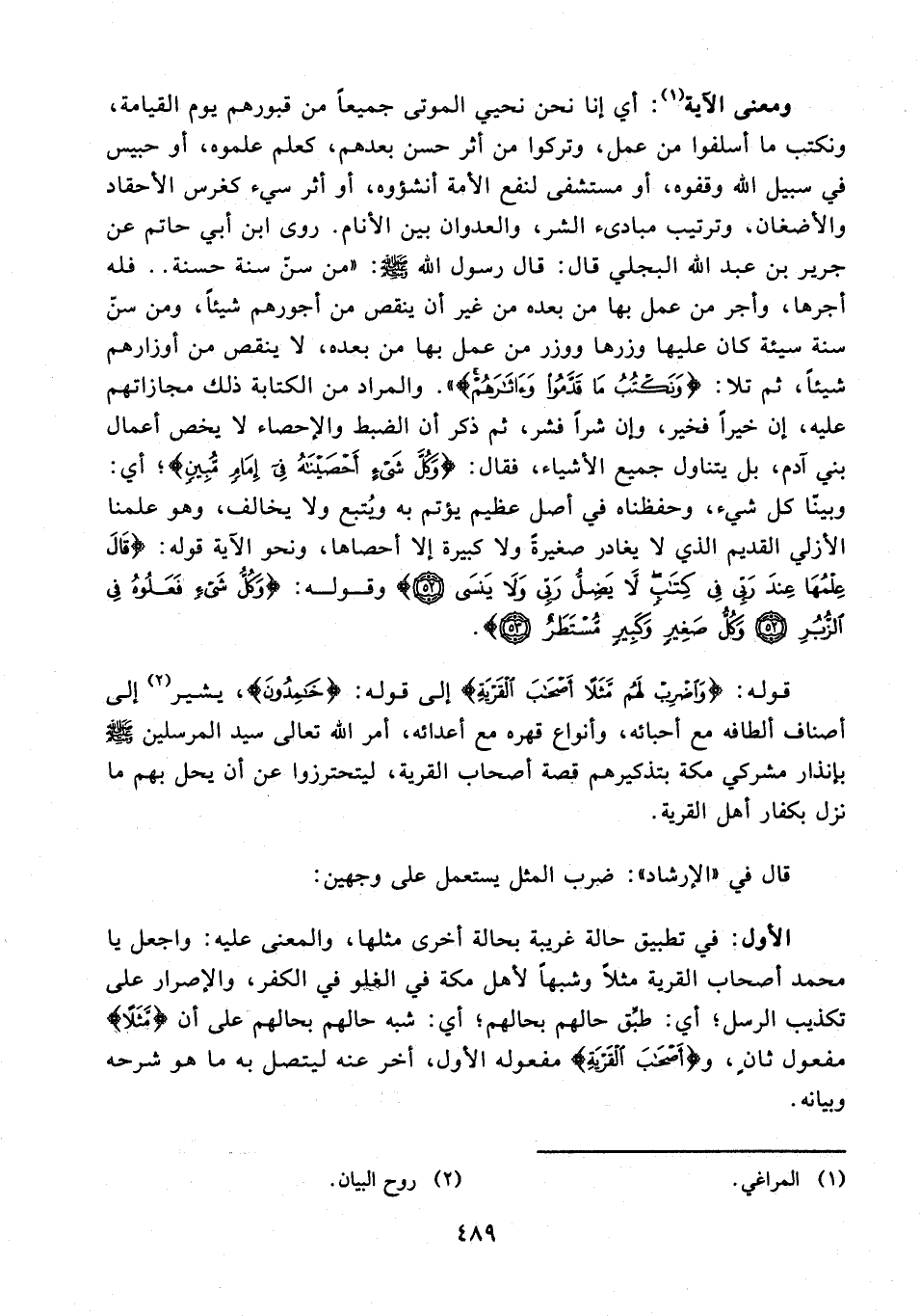 ومعنى الآية (¬1): أي إنا نحن نحيي الموتى جميعًا من قبورهم يوم القيامة، ونكتب ما أسلفوا من عمل، وتركوا من أثر حسن بعدهم، كعلم علموه، أو حبيس في سبيل الله وقفوه، أو مستشفى لنفع الأمة أنشؤوه، أو أثر سيء كغرس الأحقاد والأضغان وترتيب مبادىء الشر، والعدوان بين الأنام. روى ابن أبي حاتم عن جرير بن عبد الله البجلي قال: قال رسول الله - صلى الله عليه وسلم -: "من سنّ سنة حسنة .. فله أجرها، وأجر من عمل بها من بعده من غير أن ينقص من أجورهم شيئًا، ومن سنّ سنة سيئة كان عليها وزرها ووزر من عمل بها من بعده، لا ينقص من أوزارهم شيئًا، ثم تلا: {وَنَكْتُبُ مَا قَدَّمُوا وَآثَارَهُمْ} ". والمراد من الكتابة ذلك مجازاتهم عليه، إن خيرًا فخير، وإن شرًا فشر، ثم ذكر أن الضبط والإحصاء لا يخص أعمال بني آدم، بل يتناول جميع الأشياء، فقال: {وَكُلَّ شَيْءٍ أَحْصَيْنَاهُ فِي إِمَامٍ مُبِينٍ}؛ أي: وبينّا كل شيء، وحفظناه في أصل عظيم يؤتم به ويُتبع ولا يخالف، وهو علمنا الأزلي القديم الذي لا يغادر صغيرةً ولا كبيرة إلا أحصاها، ونحو الآية قوله: {قَالَ عِلْمُهَا عِنْدَ رَبِّي فِي كِتَابٍ لَا يَضِلُّ رَبِّي وَلَا يَنْسَى (52)} وقوله: {وَكُلُّ شَيْءٍ فَعَلُوهُ فِي الزُّبُرِ (52) وَكُلُّ صَغِيرٍ وَكَبِيرٍ مُسْتَطَرٌ (53)}.