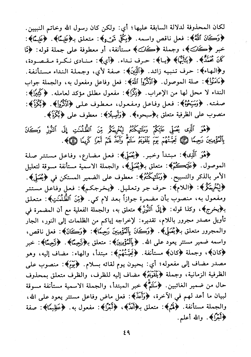 {هُوَ الَّذِي}: مبتدأ وخبر. {يُصَلِّي}: فعل مضارع، وفاعل مستتر صلة الموصول. {عَلَيْكُمْ}: متعلق بـ {يُصَلِّي}، والجملة الاسمية مستأنفة مسوقة لتعليل الأمر بالذكر والتسبيح. {وَمَلَائِكَتُهُ}: معطوف على الضمير المستكن في {يُصَلِّي}. {لِيُخْرِجَكُمْ}: {اللام}: حرف جر وتعليل. {يخرجكم}: فعل وفاعل مستتر ومفعول به، منصوب بأن مضمرة جوازًا بعد لام كي. {مِنَ الظُّلُمَاتِ}: متعلق بـ {يخرج}، وكذا قوله: {إِلَى النُّورِ} متعلق به، والجملة الفعلية مع أن المضمرة في تأويل مصدر مجرور باللام، تقديره: لإخراجه إياكم من الظلمات إلى النور، الجار والمجرور متعلق بـ {يُصَلِّي}. {وَكَانَ بِالْمُؤْمِنِينَ رَحِيمًا}: {وَكَانَ}: فعل ناقص، واسمه ضمير مستتر يعود على الله. {بِالْمُؤْمِنِينَ}: متعلق بـ {رَحِيمًا}. {رَحِيمًا}: خبر كان، وجملة {كان} مستأنفة. {تَحِيَّتُهُمْ}: مبتدأ، والهاء: مضاف إليه، وهو مصدر مضاف إلى مفعوله؛ أي: يحيون يوم لقائه بسلام. {يَوْمَ}: منصوب على الظرفية الزمانية، وجملة {يَلْقَوْنَهُ} مضاف إليه للظرف، والظرف متعلق بمحذوف حال من ضمير الغائبين. {سَلَامٌ} خبر المبتدأ، والجملة الاسمية مستأنفة مسوقة لبيان ما أعد لهم في الآخرة، {وَأَعَدَّ}: فعل ماض وفاعل مستتر يعود على الله، والجملة مستأنفة. {لَهُمْ}: متعلق بـ {أَعَدَّ}، {أَجْرًا}: مفعول به. {عَظِيمًا}: صفة {أَجْرًا}. والله أعلم.