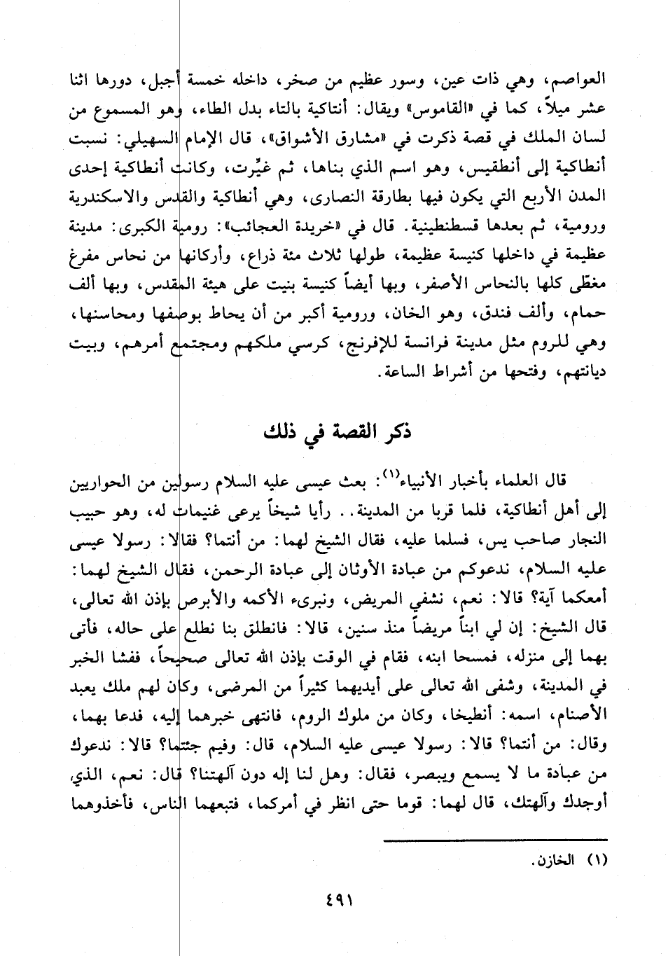 العواصم، وهي ذات عين، وسور عظيم من صخر، داخله خمسة أجبل، دورها اثنا عشر ميلًا، كما في "القاموس" ويقال: أنتاكية بالتاء بدل الطاء، وهو المسموع من لسان الملك في قصة ذكرت في "مشارق الأشواق"، قال الإِمام السهيلي: نسبت أنطاكية إلى أنطقيس، وهو اسم الذي بناها، ثم غيِّرت، وكانت أنطاكية إحدى المدن الأربع التي يكون فيها بطارقة النصارى، وهي أنطاكية والقدس والاسكندرية ورومية، ثم بعدها قسطنطينية. قال في "خريدة العجائب": رومية الكبرى: مدينة عظيمة في داخلها كنيسة عظيمة، طولها ثلاث مئة ذراع، وأركانها من نحاس مفرغ مغطّى كلها بالنحاس الأصفر، وبها أيضًا كنيسة بنيت على هيئة المقدس، وبها ألف حمام، وألف فندق، وهو الخان، ورومية أكبر من أن يحاط بوصفها ومحاسنها، وهي للروم مثل مدينة فرانسة للإفرنج، كرسي ملكهم ومجتمع أمرهم، وبيت ديانتهم، وفتحها من أشراط الساعة.
