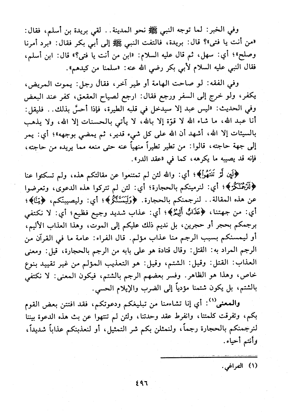 والمعنى (¬1): أي إنا تشاءمنا من تبليغكم ودعوتكم، فقد افتتن بعض القوم بكم، وتفرقت كلمتنا، وانفرط عقد وحدثنا, ولئن لم تنتهوا عن بث هذه الدعوة بيننا لنرجمنكم بالحجارة رجمًا، ولنمثلن بكم شر التمثيل، أو لنعذبنكم عذابًا شديدًا، ؤأنتم أحياء.