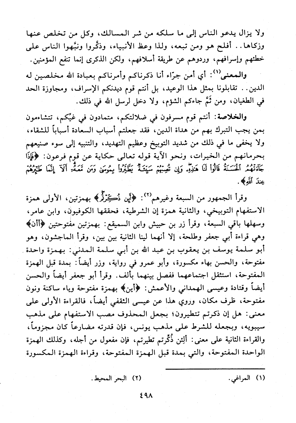 وقرأ الجمهور من السبعة وغيرهم (¬2): {أَئِنْ ذُكِّرْتُمْ} بهمزتين، الأولى همزة الاستفهام التوبيخي، والثانية همزة إن الشرطية، فحققها الكوفيون، وابن عامر، وسهلها باقي السبعة، وقرأ زر بن حبيش وابن السميقع: بهمزتين مفتوحتين {أأن} وهي قراءة أبي جعفر وطلحة، إلا أنهما لينا الثانية بين بين، وقرأ الماجشون، وهو أبو سلمة يوسف بن يعقوب بن عبد الله بن أبي سلمة المدني: بهمزة واحدة مفتوحة، والحسن بهاء مكسورة، وأبو عمرو في رواية, وزر أيضًا: بمدة قبل الهمزة المفتوحة، استثقل اجتماعهما ففصل بينهما بألف. وقرأ أبو جعفر أيضًا والحسن أيضًا وقتادة وعيسى الهمداني والأعمش: {أين} بهمزة مفتوحة وياء ساكنة ونون مفتوحة، ظرف مكان، وروي هذا عن عيسى الثقفي أيضًا، فالقراءة الأولى على معنى: هل إن ذكرتم تتطيرون؛ بجعل المحذوف مصب الاستفهام على مذهب سيبويه، وبجعله للشرط على مذهب يونس، فإن قدرته مضارعًا كان مجزومًا، والقراءة الثانية على معنى: ألِئن ذُكِّرتم تطيرتم، فإن مفعول من أجله، وكذلك الهمزة الواحدة المفتوحة، والتي بمدة قبل الهمزة المفتوحة، وقراءة الهمزة المكسور