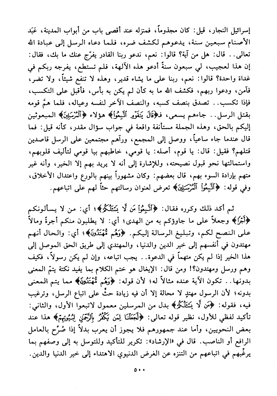 21 - ثم أكد ذلك وكرره فقال: {اتَّبِعُوا مَنْ لَا يَسْأَلُكُمْ}؛ أي: من لا يسألونكم {أَجْرًا} وجعلًا على ما جاوؤكم به أو الهدى؛ أي: لا يطلبون منكم أجرةً ومالًا على النصح لكم، وتبليغ الرسالة إليكم. {وَهُمْ مُهْتَدُونَ}؛ أي: والحال أنهم مهتدون في أنفسهم إلى خير الدين والدنيا، والمهتدي إلى طريق الحق الموصل إلى هذا الخير إذا لم يكن متهمًا في الدعوة .. يجب اتباعه، وإن لم يكن رسولًا، فكيف وهم ورسل ومهتدون؟! ومن قال: الإيغال هو ختم الكلام بما يفيد نكتة يتمّ المعنى بدونها .. تكون الآية عنده مثالًا له؛ لأن قوله: {وَهُمْ مُهْتَدُونَ} مما يتم المعنى بدونه؛ لأن الرسول مهتدٍ لا محالة إلا أن فيه زيادة حث على اتباع الرسل، وترغيب فيه، فقوله: {مَنْ لَا يَسْأَلُكُمْ} بدل أو المرسلين معمول لاتبعوا النقول، والثاني: تأكيد لفظي للأول، نظير قوله تعالى: {لَجَعَلْنَا لِمَنْ يَكْفُرُ بِالرَّحْمَنِ لِبُيُوتِهِمْ} هذا عند بعض النحويين، وأما عند جمهورهم فلا يجوز أو يعرب بدلًا إذا صُرِّح بالعامل الرافع أو الناصب. قال في "الإرشاد": تكرير للتأكيد وللتوسل به إلى وصفهم بما يرغبهم في اتباعهم أو التنزه عن الغرض الدنيوي الاهتداء إلى خير الدنيا والدين.
