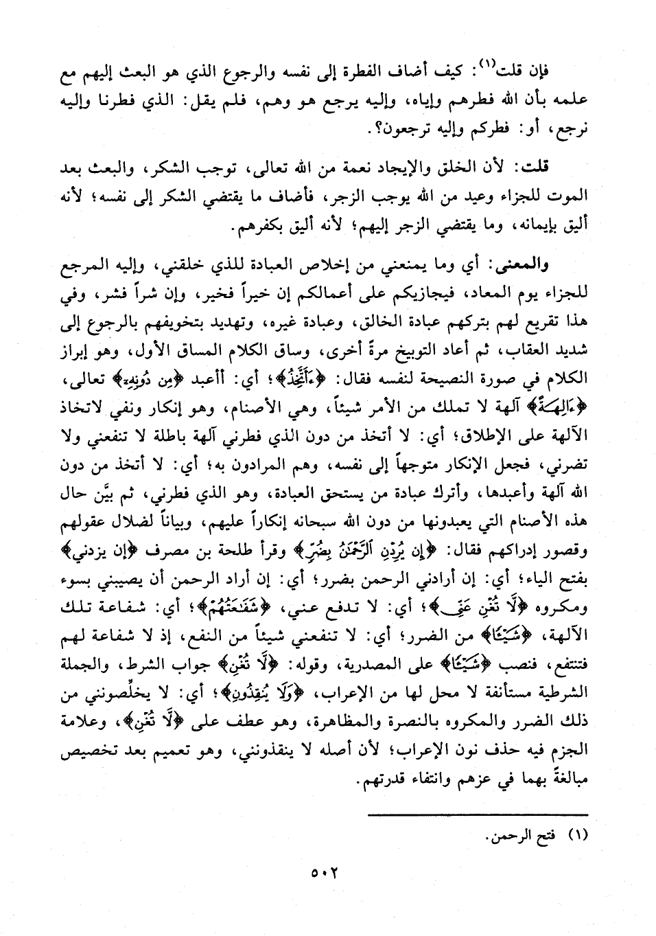 فإن قلت (¬1): كيف أضاف الفطرة إلى نفسه والرجوع الذي هو البعث إليهم مع علمه بأن الله فطرهم وإياه، وإليه يرجع هو وهم، فلم يقل: الذي فطرنا وإليه نرجع، أو: فطركم وإليه ترجعون؟.