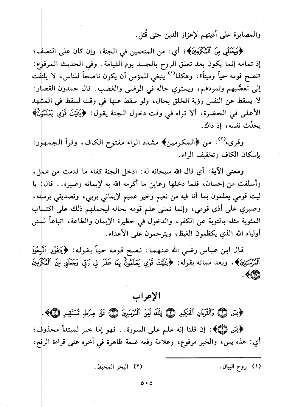 {وَجَعَلَنِي مِنَ الْمُكْرَمِينَ}؛ أي: من المنعمين في الجنة، وإن كان على النصف؛ إذ تمامه إنما يكون بعد تعلق الروح بالجسد يوم القيامة. وفي الحديث المرفوع: "نصح قومه حيًا وميتًا"، وهكذا (¬1) ينبغي للمؤمن أن يكون ناصحًا للناس، إلى تعصُّبهم وتمردهم، ويستوي حاله في الرضى والغضب. قال حمدون القصار: لا يسقط عن النفس رؤية الخلق بحال، ولو سقط عنها في وقت لسقط في المشهد الأعلى في الحضرة، ألا تراه في وقت دخول الجنة يقول: {يَا لَيْتَ قَوْمِي يَعْلَمُونَ} يحدِّث نفسه، إذ ذاك.
