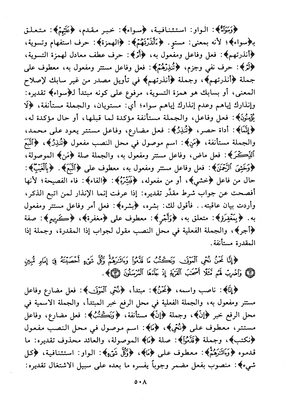 {وَسَوَاءٌ}: الواو: استئنافية، {سواء}: خبر مقدم، {عَلَيْهِمْ}: متعلق بـ {سواء}؛ لأنه بمعنى: مستوٍ. {أَأَنْذَرْتَهُمْ}: {الهمزة}: حرف استفهام وتسوية، {أنذرتهم}: فعل وفاعل ومفعول به، {أَمْ}: حرف عطف معادل لهمزة التسوية، {لَمْ}: حرف نفي وجزم، {تُنْذِرْهُمْ}: فعل وفاعل مستتر ومفعول به، معطوف على جملة {أَنْذَرْتَهُمْ}، وجملة {أَنْذَرْتَهُمْ} في تأويل مصدر من غير سابك لإصلاح المعنى، أو بسابك هو همزة التسوية، مرفوع على كونه مبتدأ لـ {سَوَاءٌ} تقديره: وإنذارك إياهم وعدم إنذارك إياهم سواء؛ أي: مستويان، والجملة مستأنفة، {لَا يُؤْمِنُونَ}: فعل وفاعل، والجملة مستأنفة مؤكدة لما قبلها، أو حال مؤكدة له، {إِنَّمَا}: أداة حصر، {تُنْذِرُ}: فعل مضارع، وفاعل مستتر يعود على محمد، والجملة مستأنفة، {مَنِ}: اسم موصول في محل النصب مفعول {تُنْذِرُ}، {اتَّبَعَ الذِّكْرَ}: فعل ماضٍ، وفاعل مستتر ومفعول به، والجملة صلة {مَن} الموصولة، {وَخَشِيَ الرَّحْمَن}: فعل وفاعل مستتر ومفعول به، معطوف على {اتَّبَعَ}. {بِالْغَيْبِ}: حال من فاعل {خشي}، أو من مفعوله، {فَبَشِّرْهُ}: {الفاء}: فاء الفصيحة؛ لأنها أفصحت عن جواب شرط مقدر تقديره: إذا عرفت إنما الإنذار لمن اتبع الذكر، وأردت بيان عاقبته .. فأقول لك: بشره، {بشره}: فعل أمر وفاعل مستتر ومفعول به. {بِمَغْفِرَةٍ}: متعلق به، {وَأَجْرٍ}: معطوف على {مَغْفِرَةٍ}، {كَرِيمٍ}: صفة {أجر}، والجملة الفعلية في محل النصب مقول لجواب إذا المقدرة، وجملة إذا المقدرة مستأنفة.