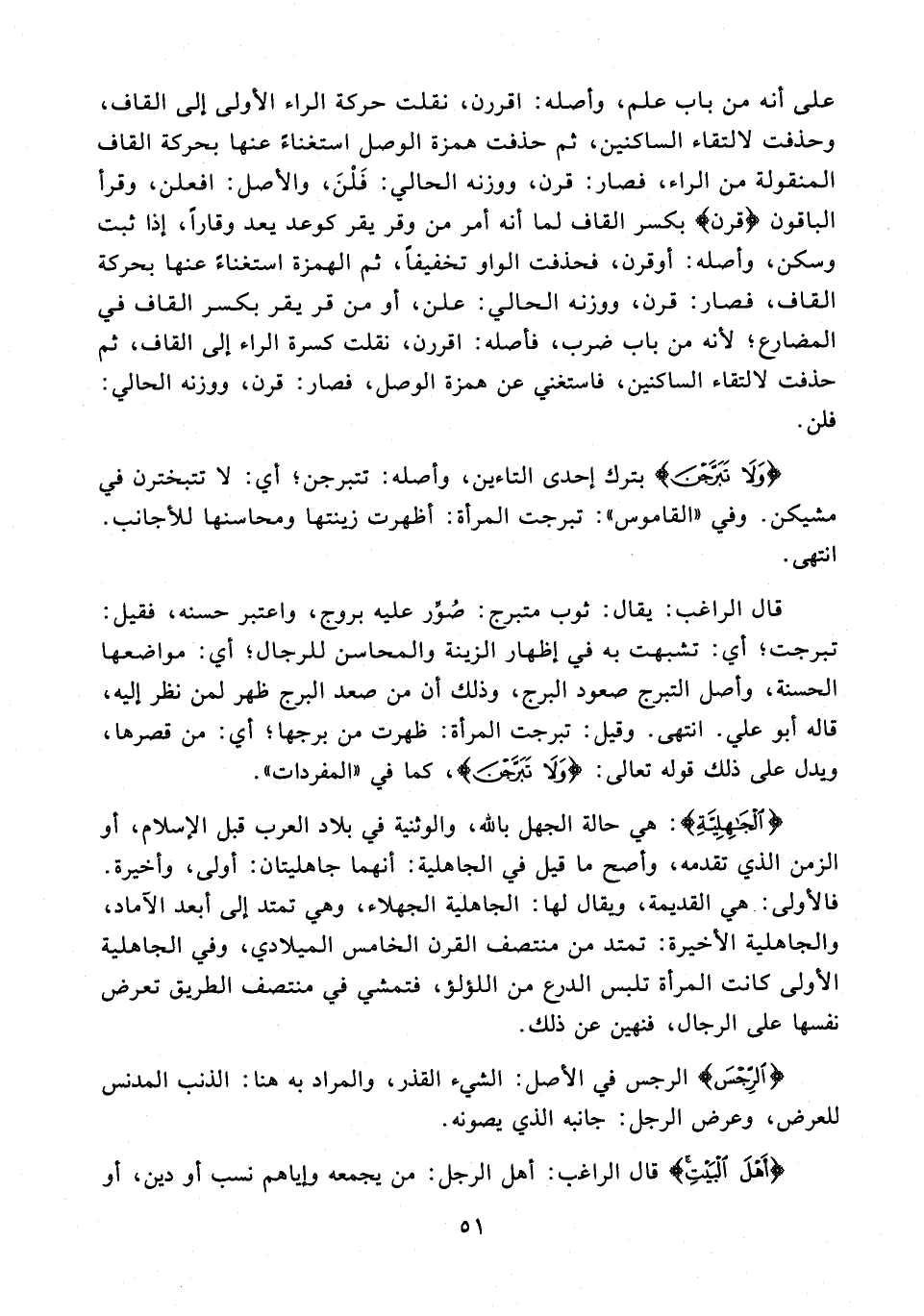 {الْجَاهِلِيَّةِ}: هي حالة الجهل بالله، والوثنية في بلاد العرب قبل الإِسلام، أو الزمن الذي تقدمه، وأصح ما قيل في الجاهلية: أنهما جاهليتان: أولى، وأخيرة. فالأولى: هي القديمة، ويقال لها: الجاهلية الجهلاء، وهي تمتد إلى أبعد الآماد، والجاهلية الأخيرة: تمتد من منتصف القرن الخامس الميلادي، وفي الجاهلية الأولى كانت المرأة تلبس الدرع من اللؤلؤ، فتمشي في منتصف الطريق تعرض نفسها على الرجال، فنهين عن ذلك.
