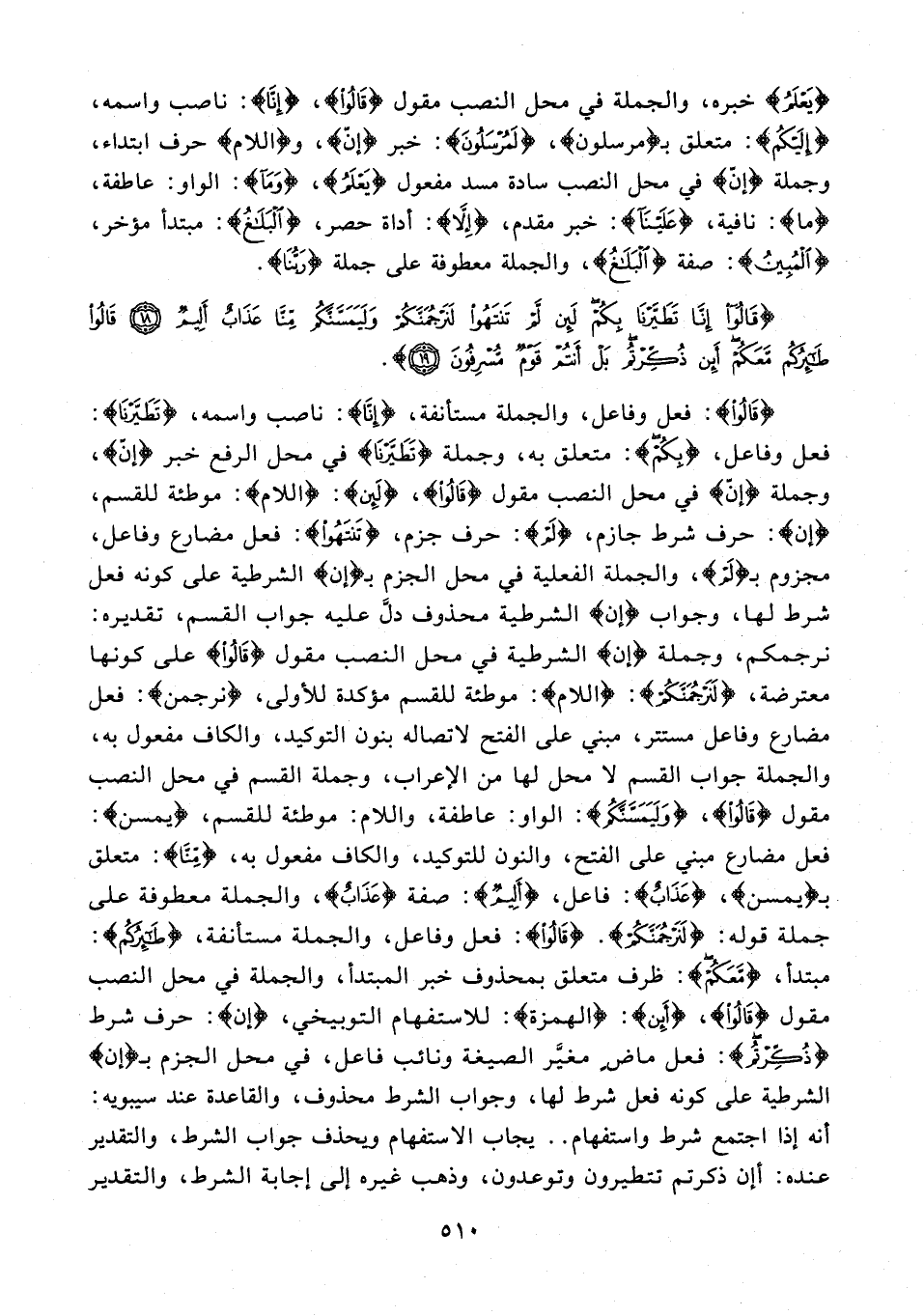 {قَالُوا}: فعل وفاعل، والجملة مستأنفة، {إِنَّا}: ناصب واسمه، {تَطَيَّرْنَا}: فعل وفاعل، {بِكُمْ}: متعلق به، وجملة {تَطَيَّرْنَا} في محل الرفع خبر {إِنّ}، وجملة {إِنّ} في محل النصب مقول {قَالُوا}، {لَئِنْ}: {اللام}: موطئة للقسم، {إن}: حرف شرط جازم، {لَمْ}: حرف جزم، {تَنْتَهُوا}: فعل مضارع وفاعل، مجزوم بـ {لَمْ}، والجملة الفعلية في محل الجزم بـ {إن} الشرطية على كونه فعل شرط لها، وجواب {إن} الشرطية محذوف دل عليه جواب القسم، تقديره: نرجمكم، وجملة {إن} الشرطية في محل النصب مقول {قَالُوا} على كونها معترضة، {لَنَرْجُمَنَّكُمْ}: {اللام}: موطئة للقسم مؤكدة للأولى، {نرجمن}: فعل مضارع وفاعل مستتر، مبني على الفتح لاتصاله بنون التوكيد، والكاف مفعول به، والجملة جواب القسم لا محل لها من الإعراب، وجملة القسم في محل النصب مقول {قَالُوا}، {وَلَيَمَسَّنَّكُمْ}: الواو: عاطفة، واللام: موطئة للقسم، {يمسن}: فعل مضارع مبني على الفتح، والنون للتوكيد، والكاف مفعول به، {مِنَّا}: متعلق بـ {يمسن}، {عَذَابٌ}: فاعل، {أَلِيمٌ}: صفة {عَذَابٌ}، والجملة معطوفة على جملة قوله: {لَنَرْجُمَنَّكُمْ}. {قَالُوا}: فعل وفاعل، والجملة مستأنفة، {طَائِرُكُمْ}: مبتدأ، {مَعَكُمْ}: ظرف متعلق بمحذوف خبر المبتدأ، والجملة في محل النصب مقول {قَالُوا}، {أَئِنْ}: {الهمزة}: للاستفهام التوبيخي، {إن}: حرف شرط {ذُكِّرْتُمْ}: فعل ماضٍ مغيَّر الصيغة ونائب فاعل، في محل الجزم بـ {إن} الشرطية على كونه فعل شرط لها، وجواب الشرط محذوف، والقاعدة عند سيبويه: أنه إذا اجتمع شرط واستفهام .. يجاب الاستفهام ويحذف جواب الشرط، والتقدير عنده: أإن ذكرتم تتطيرون وتوعدون، وذهب غيره إلى إجابة الشرط، والتقدير