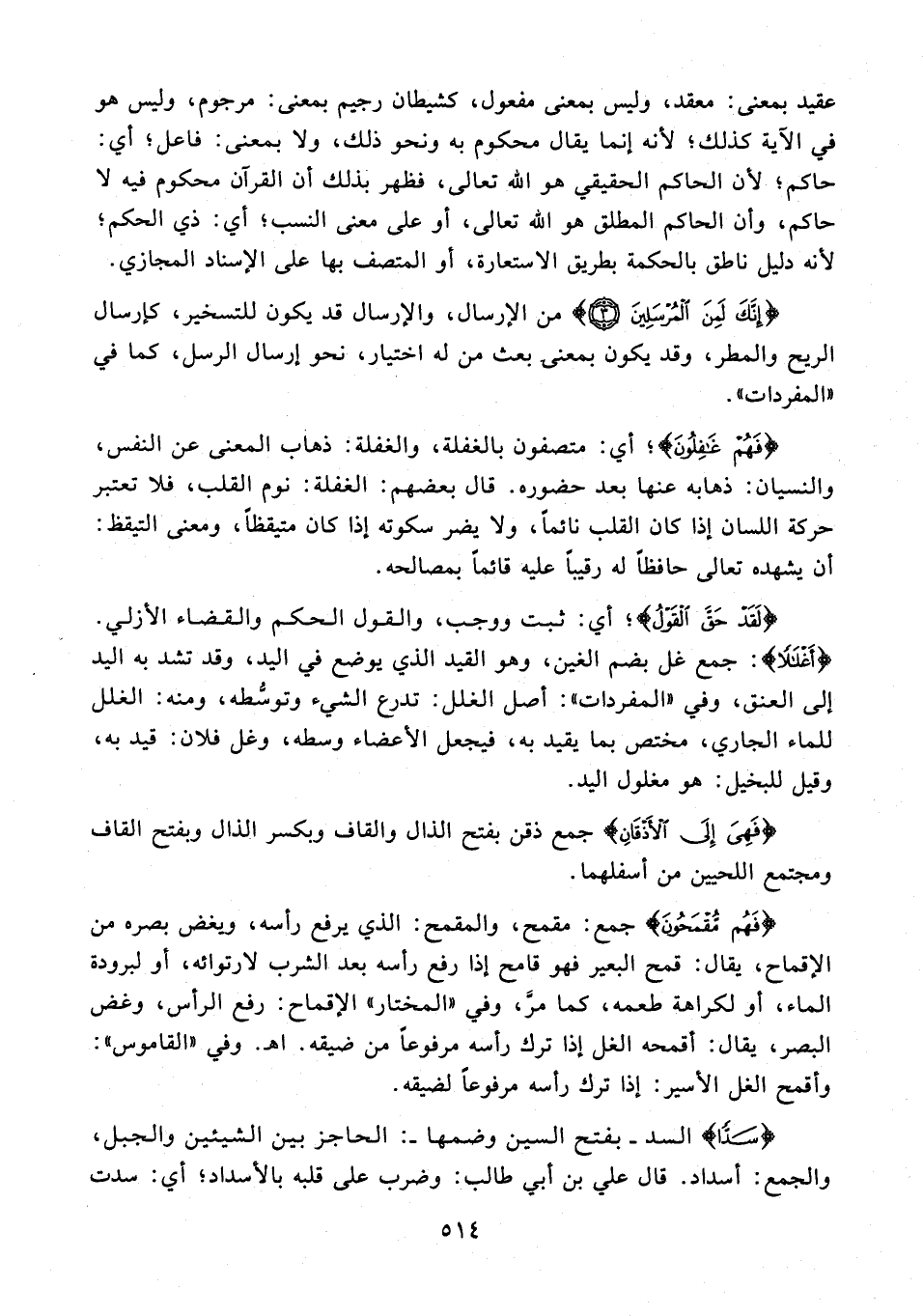{لَقَدْ حَقَّ الْقَوْلُ}؛ أي: ثبت ووجب، والقول الحكم والقضاء الأزلي. {أَغْلَالًا}: جمع غل بضم الغين، وهو القيد الذي يوضع في اليد، وقد تشد به اليد إلى العنق، وفي "المفردات": أصل الغلل: تدرع الشيء وتوسُّطه، ومنه: الغلل للماء الجاري، مختص بما يقيد به، فيجعل الأعضاء وسطه، وغل فلان: قيد به، وقيل للبخيل: هو مغلول اليد.