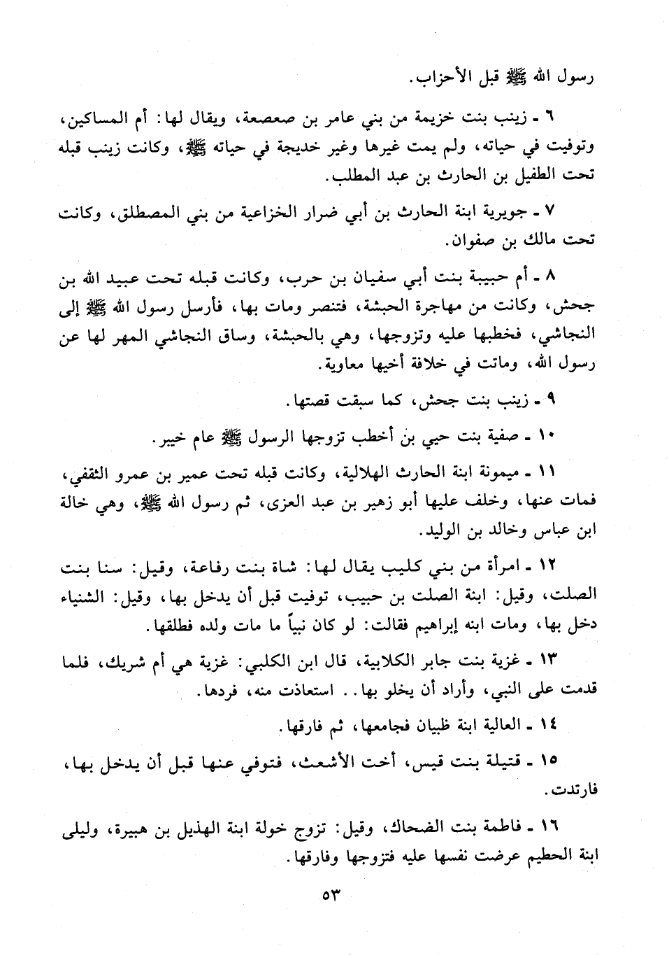7 - جويرية ابنة الحارث بن أبي ضرار الخزاعية من بني المصطلق، وكانت تحت مالك بن صفوان.